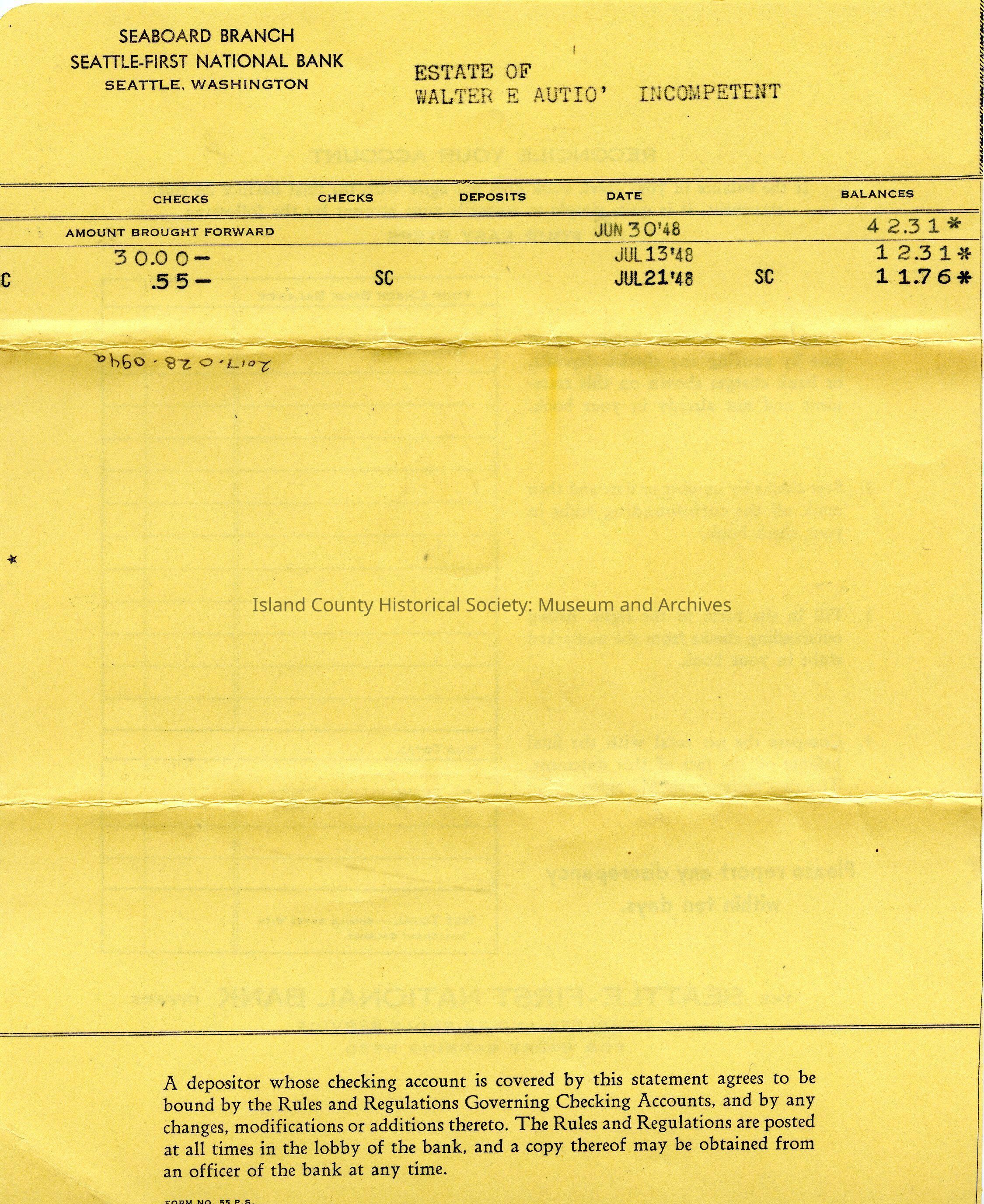 Bank statement for estate of Walter Autio June 30 1948 to July 21 1948. Seaboard Branch Seattle-First National Bank.