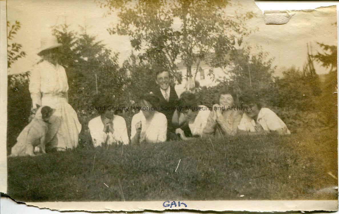 A black and white photo of a group of people outside. There are a total of seven people in the photo; six women and one man. There is also a dog in the photo. The man is in the middle of the photo and he has his hand near one of the women's head. Five of the women are laying on the ground and the sixth woman (far left) is kneeling with the dog sitting next to her. All of the women are wearing light-colored dresses. The man is wearing a suit and tie. There is a house and trees in the background. The bottom of the photo says, "GAK".