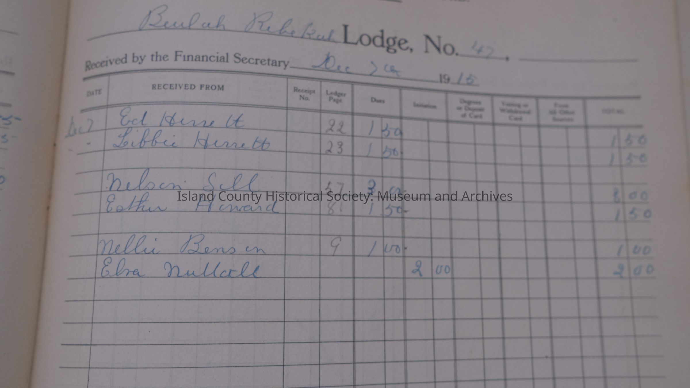 (no author), Beulah Rebekah Lodge No 47 of Coupeville Washington Records, Minutes ledger 21 April 1906-16 December 1919. 2016.012.002 6.1906Lexicon