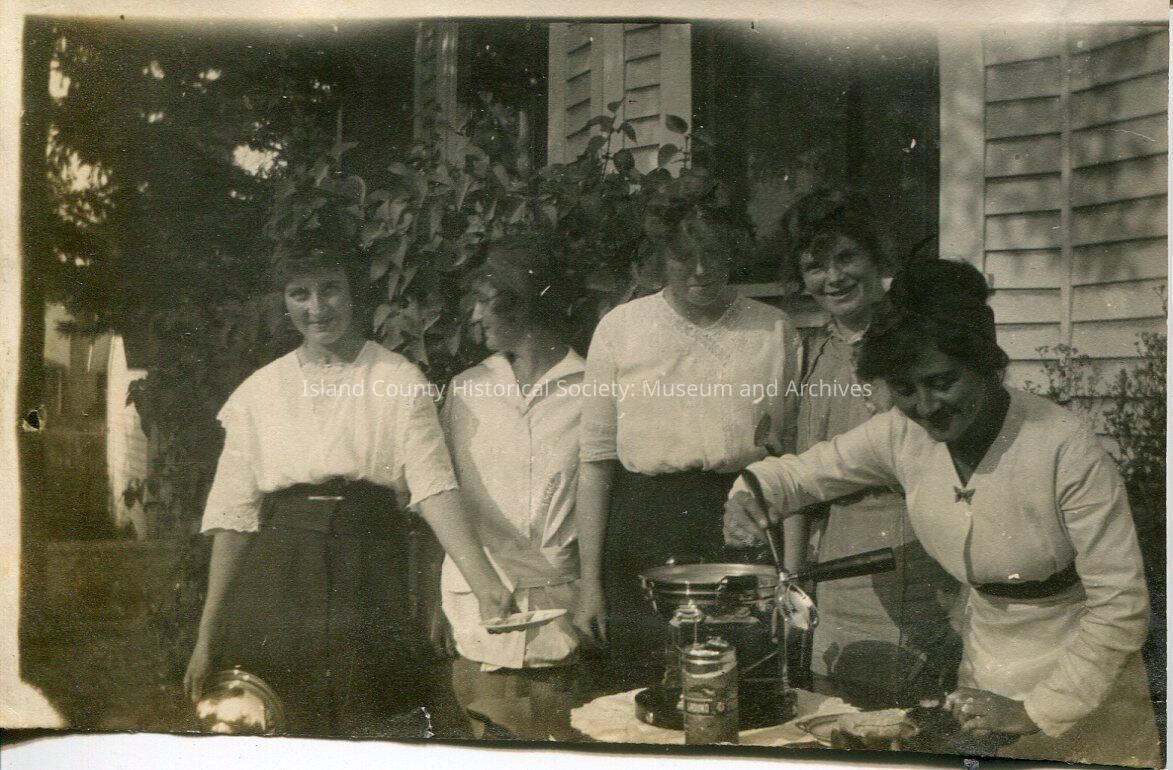 A black and white photo of a group of women outdoors. The woman on the far right appears to be frying something. She has a large spoon in her right hand. The woman on the far left is holding out a plate. There are five women total and they are all wearing skirts and all have their hair pulled back. They are standing outside a house.