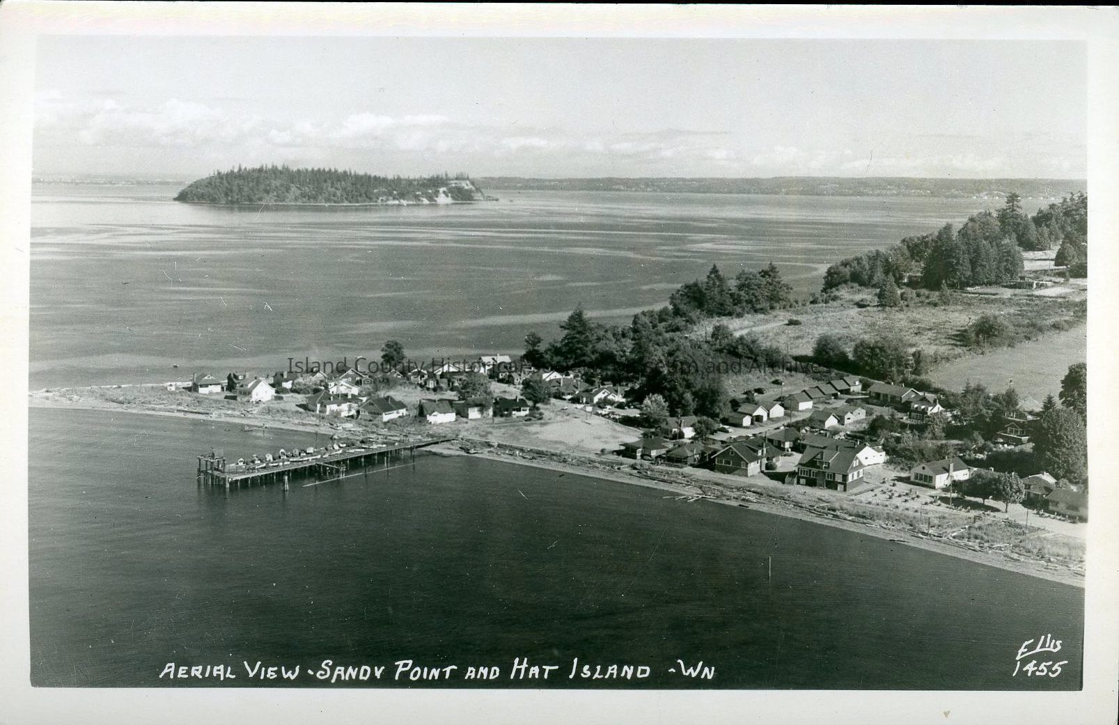 Postcard of Sandy Point (foreground) and Hat Island (background), c. 1940s.Collection