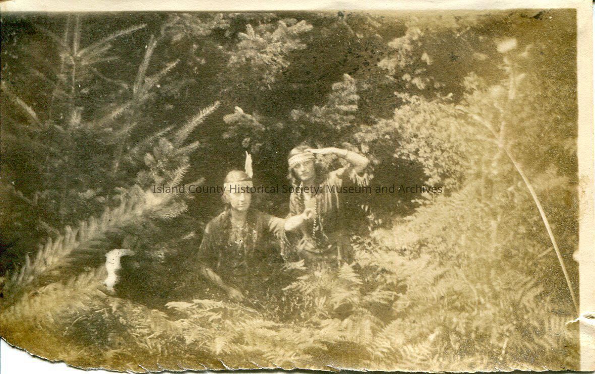 A photo of two women dressed as Native Americans, sitting between trees. There are wearing fringed-clothes and headbands with feathers. One woman has her arm extended and the other woman has one of her hands up to her headband.