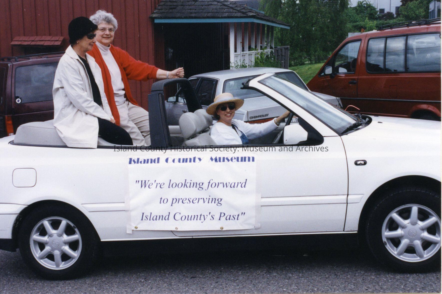 A photo of three ladies in a white car. Two are sitting up in the back. It must be in a parade. On the side of the car is the sign "Island County Museum "We're looking forward to preserving Island County's Past."