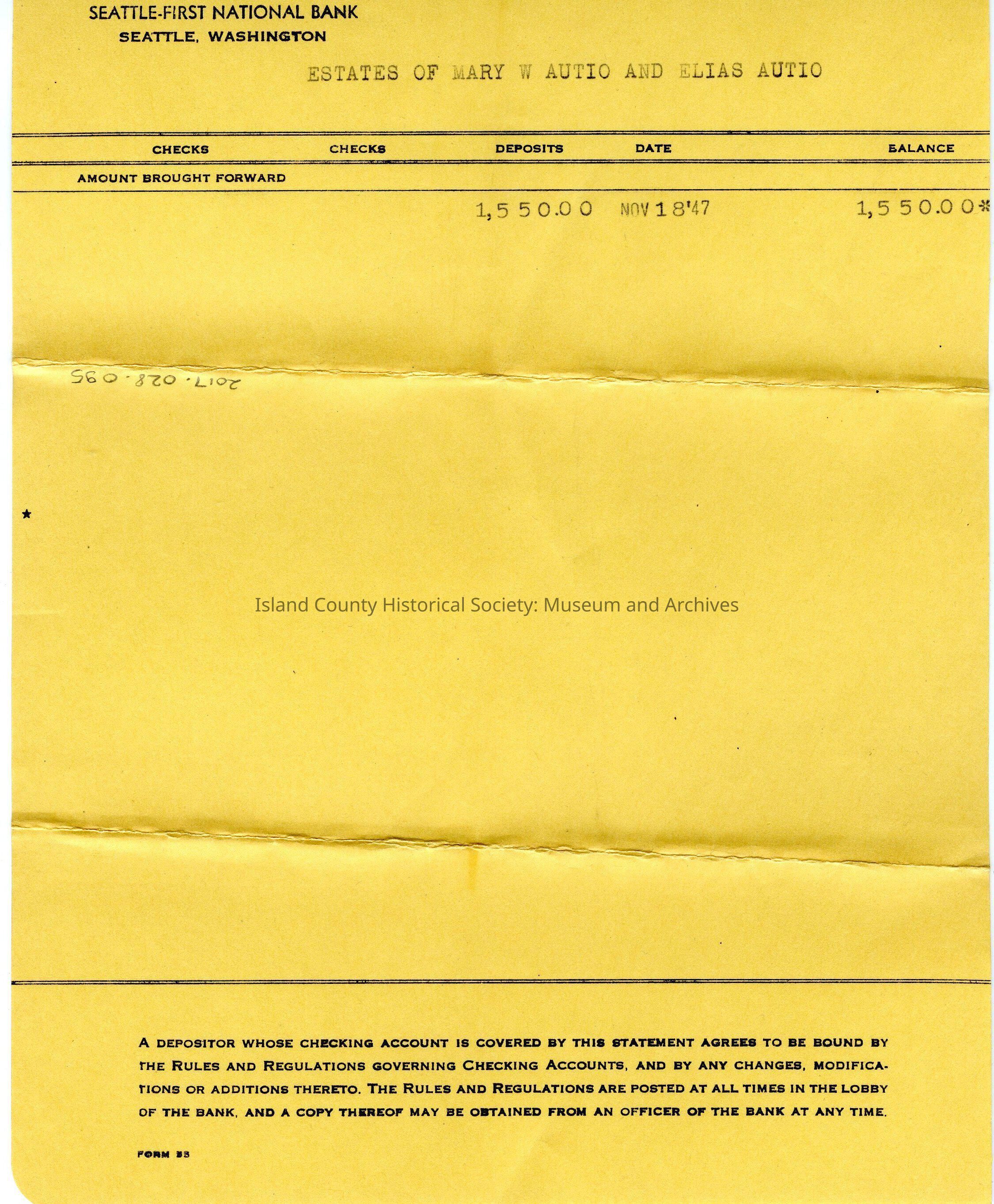 Bank statement for estates of Mary W Autio and Elias Autio from the Seaboard Branch of the Seattle First National Bank. On yellow card. Deposit into account November 18 1947