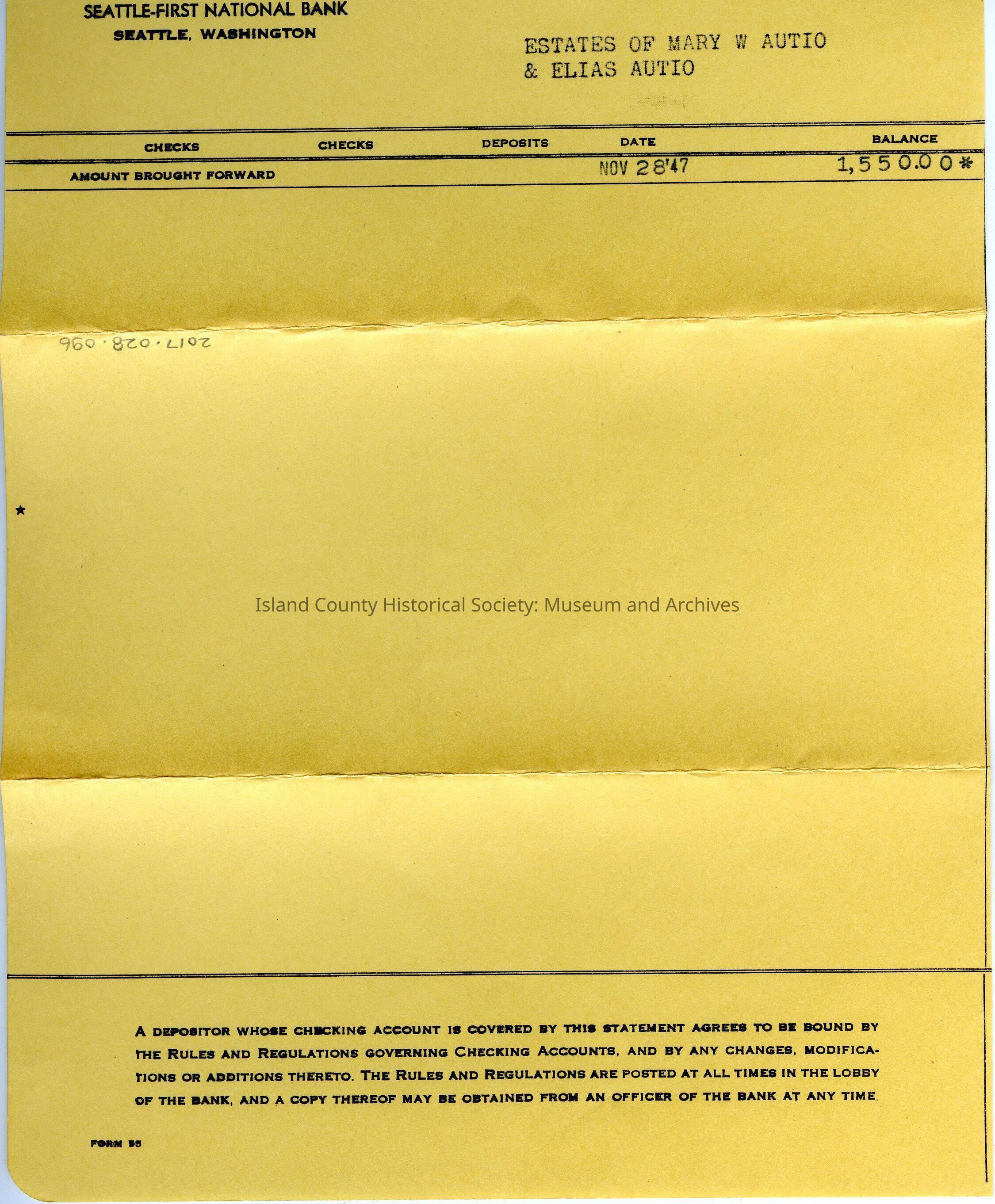 Bank statement for estates of Mary W Autio and Elias Autio from the Seaboard Branch of the Seattle First National Bank. On yellow card. Balance given as of November 28 1947