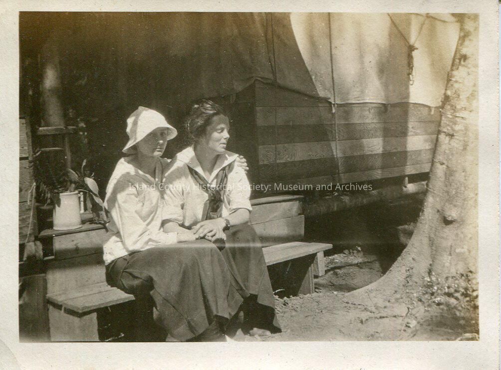 A photo of two women sitting on a step in front of a wooden house/building. The younger woman has her arm around the shoulders of an older woman. The younger woman is wearing a white hat. Both women are wearing white shirts and dark-colored skirts. The older woman has a scarf loosely-tied around her neck.