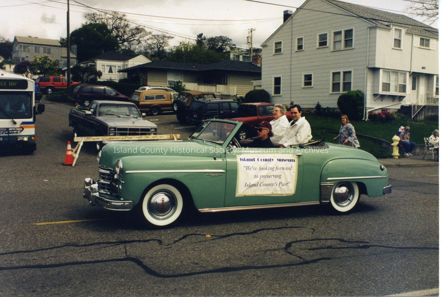 A photo of people in a green older car in a parade. On the side of the car is a sign "Island County Museum."