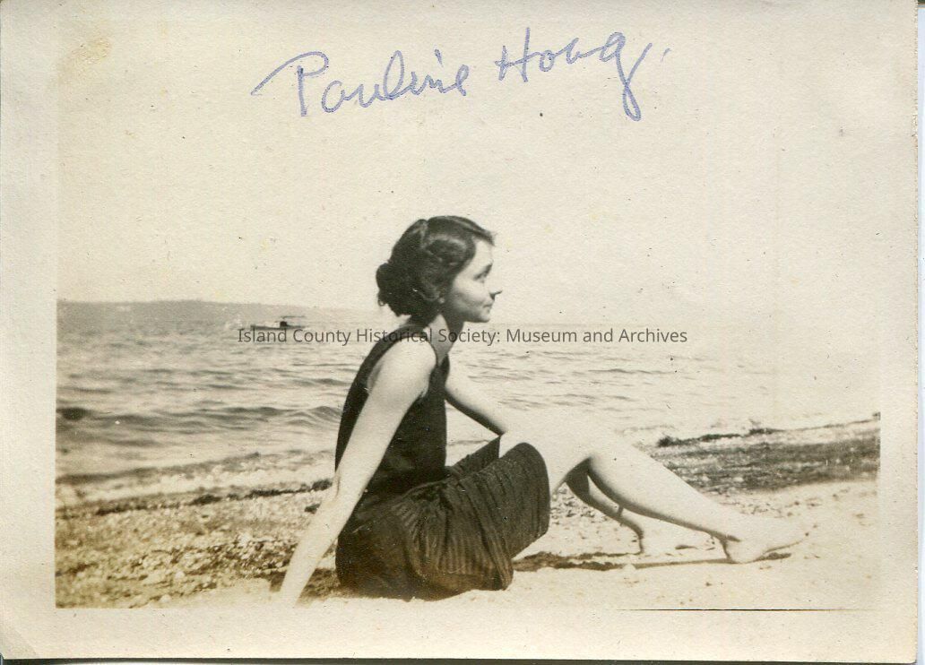 A black and white photo of a young woman sitting on the beach. She is wearing dark-colored swim attire. She is not looking at the camera. The top of the photo says, "Pauline Hoag".