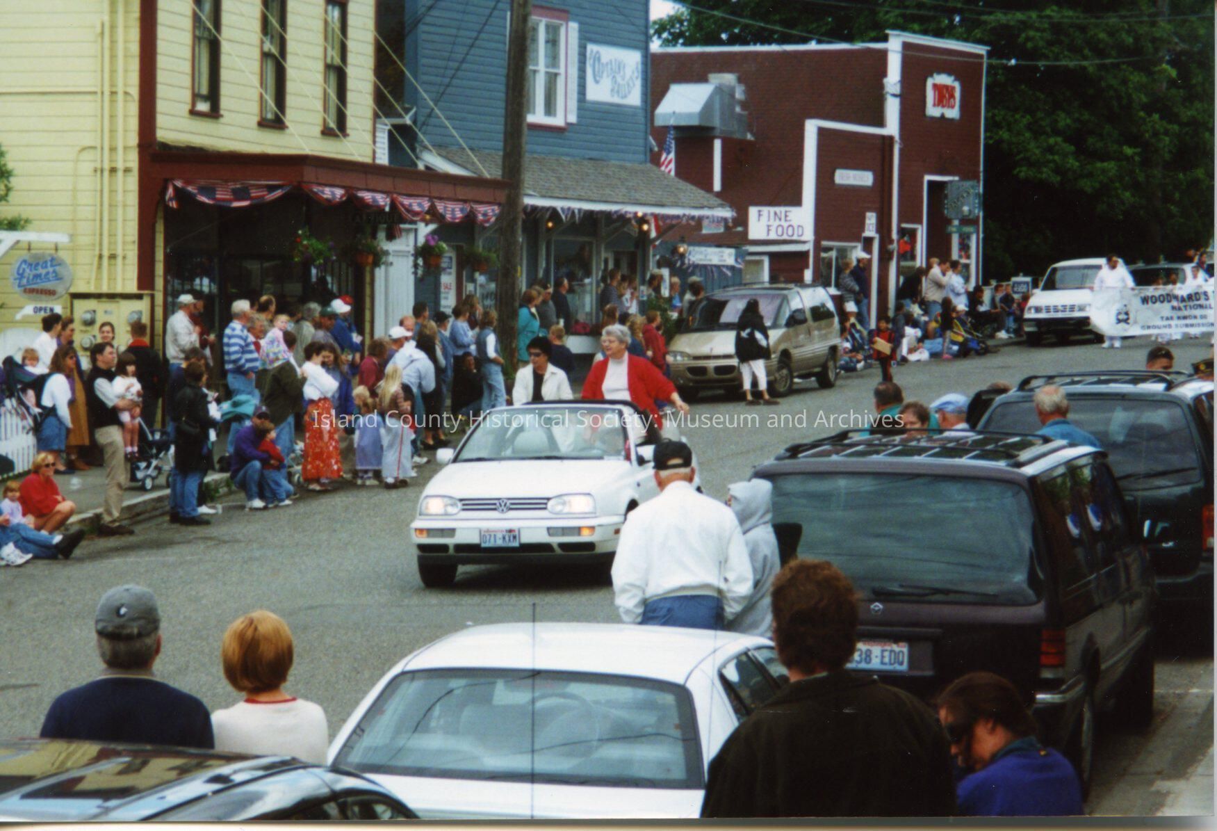 A photo of a white car in a parade on Front Street. In the car are three ladies.