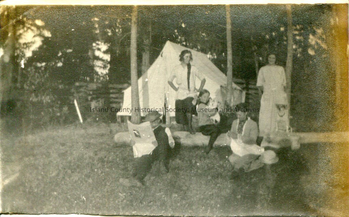 A black and white photo of a group of people outside of a white tent in the woods. There are three adult females, one adult male and young girl. The man is sitting on the ground, reading a newspaper. One of the woman is also sitting on the ground and she appears to be sewing. The little girl is holding either a small animal or a toy. There is also a dog on the right side of the photo.