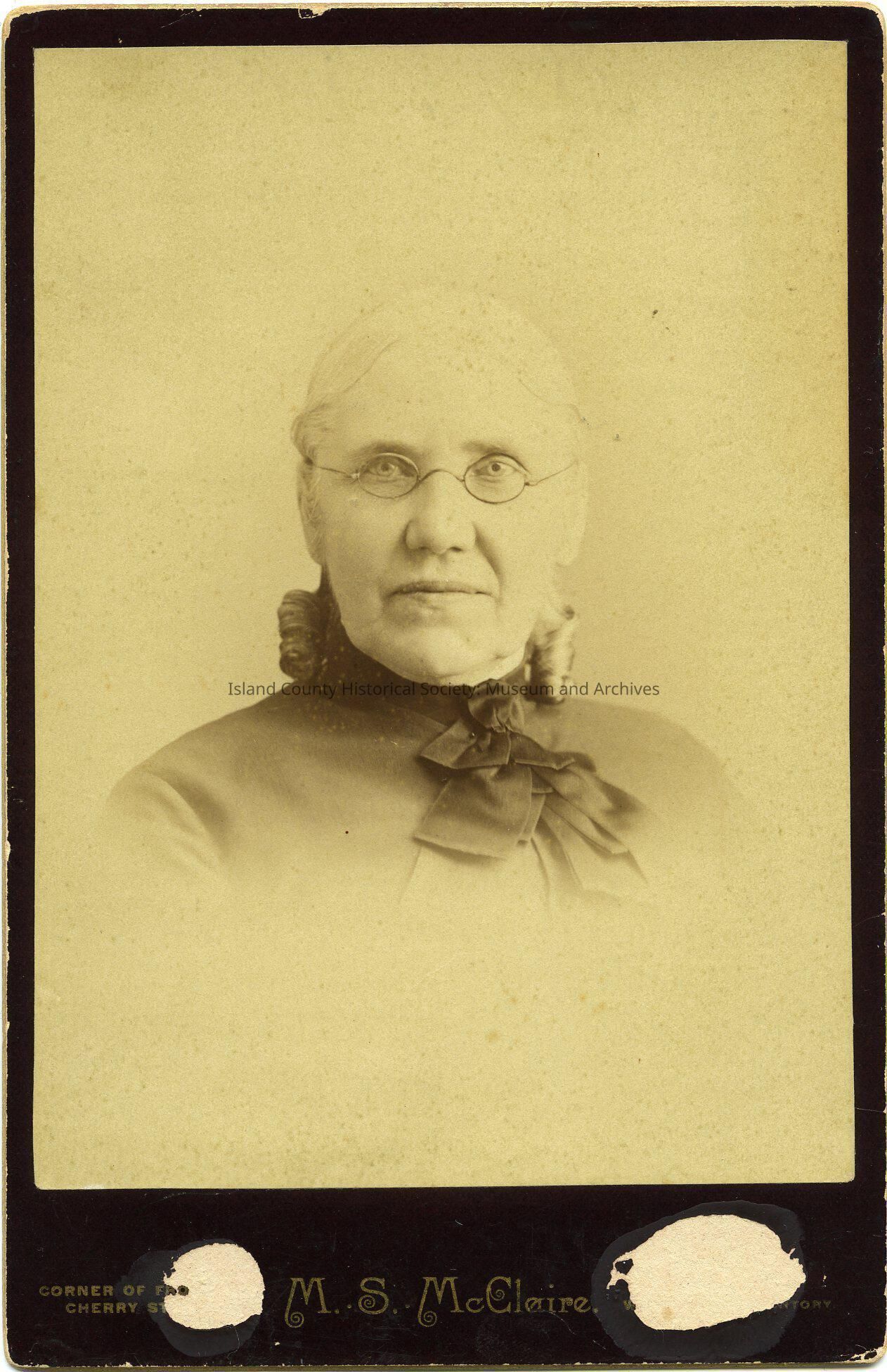 Studio portrait of a woman from the shoulders up. She is wearing glasses. On the back: Chloe Ann Terry Doyle, 60 years old, March 6, 1887. Born March 6, 1827, in Syracuse, New York. Came to the west November, 1852. 25 years old at the time of the trip. Married Reuben L. Doyle at Ebey's Landing, April 25, 1853.Made/Created