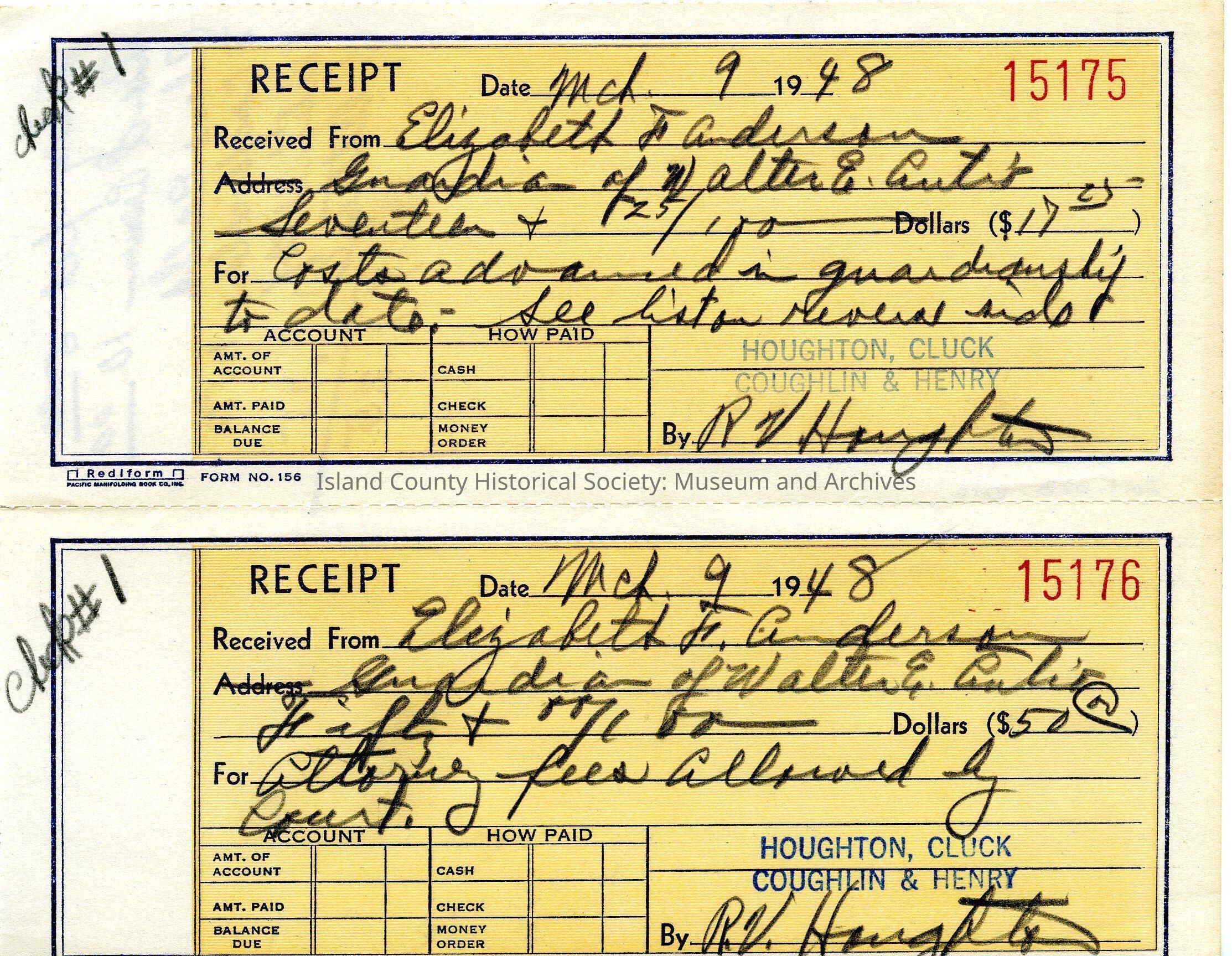 Receipt numbered 15175 dated March 9 1948 received from Elizabeth Anderson relating to guardianship costs. Orange background and blue outline. Attached to 2017.028.101b. Pencil notes on back.