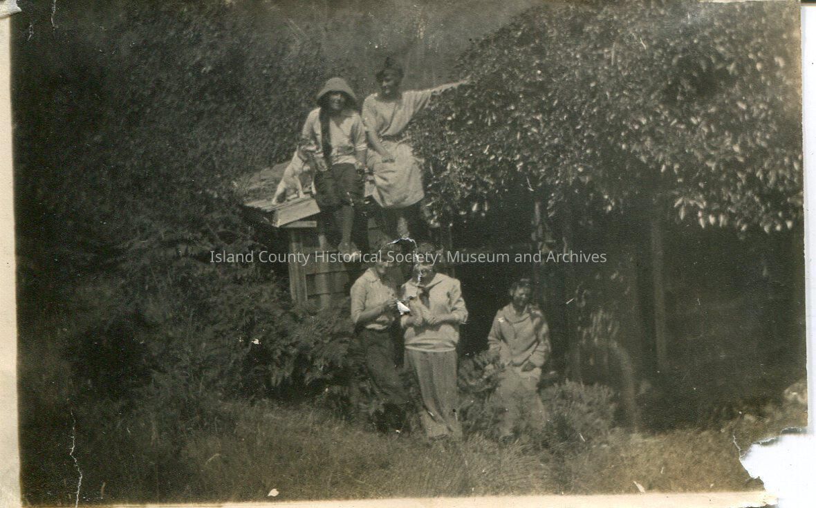 A black and white photo of a group of five women outside by a house that appears to be overgrown by foliage. Two of the women are sitting on a low part of the roof of the house. The other three women are standing in front of the house. All five women are wearing dresses/skirts.