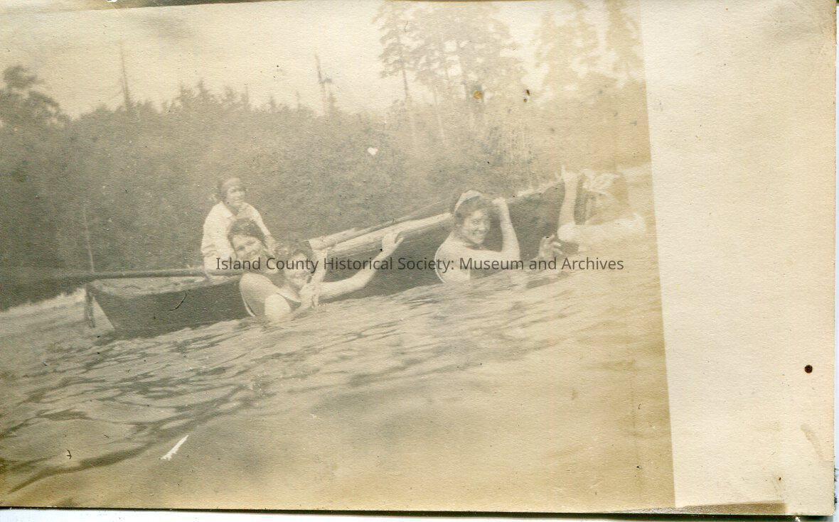 A photo of a group of five women around a small boat in the water. One of the women is sitting in the boat, the other four women are holding onto the boat while floating in the water. The foreground is water and the background is trees. All of the women are smiling at the camera.