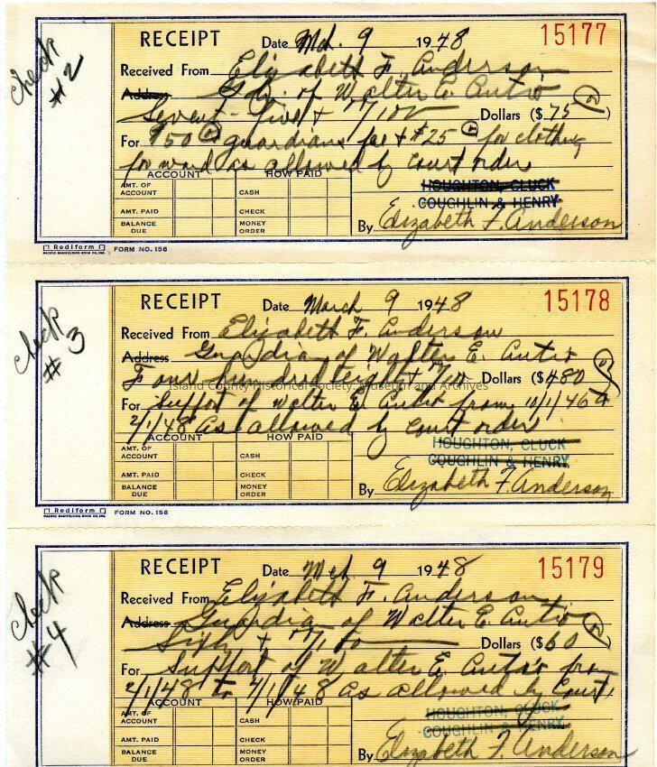 Receipt numbered 15179 dated March 9 1948 received from Elizabeth Anderson relating to guardianship costs. Orange background and blue outline. Attached to 2017.028.102a and b.