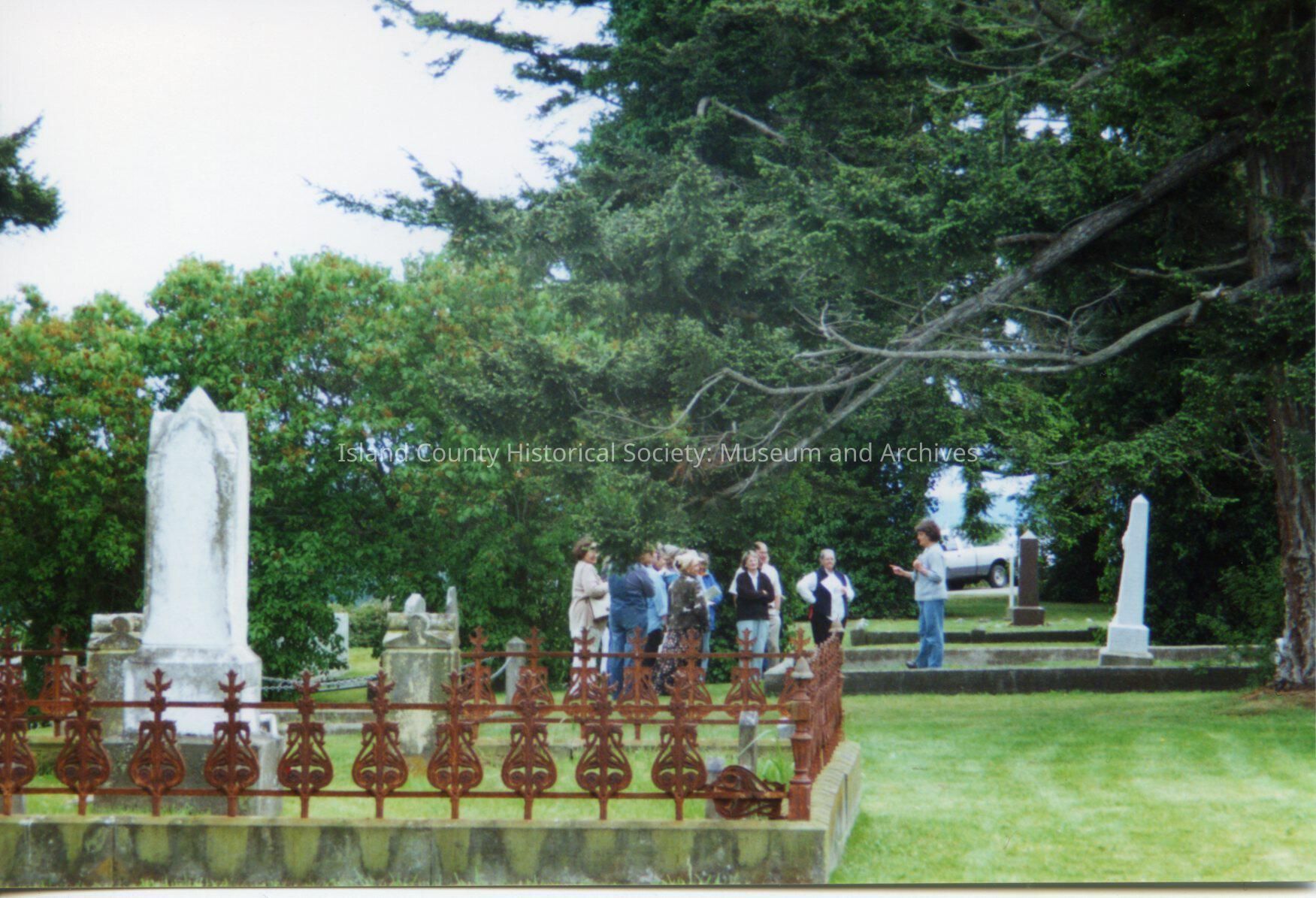 A photo of people at a graveyard. One lady is talking to others.