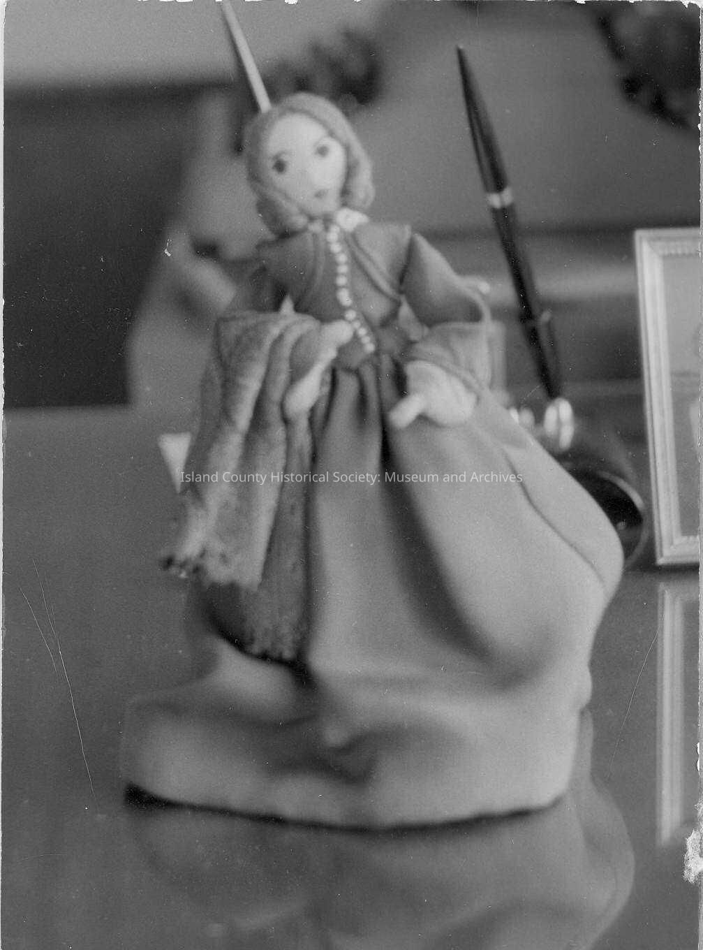 Mounting for photo inscribed "To the Whibey Island Historical, Society from Alice Kellogg Cahail (sic). Doll made from picture of Chloe Doyle; in the pioneer doll collection of Mrs. Clair Hopeman of Anacortes".