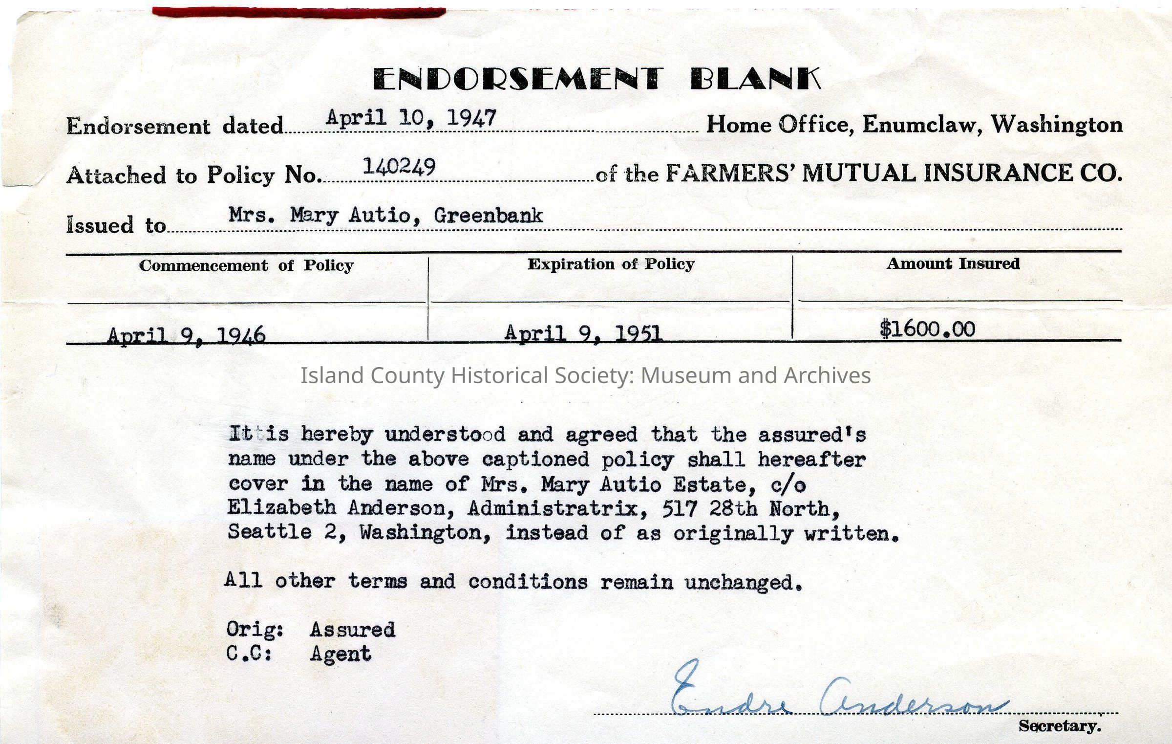 Endorsement statement dated April 10 1947 from Farmers' Mutual Insurance Co. insuring Mary Autio (Elizabeth Anderson by extention) from April 9 1946 to April 9 1951. Signed by the secretary. On back is gold sticker with Important! notice.