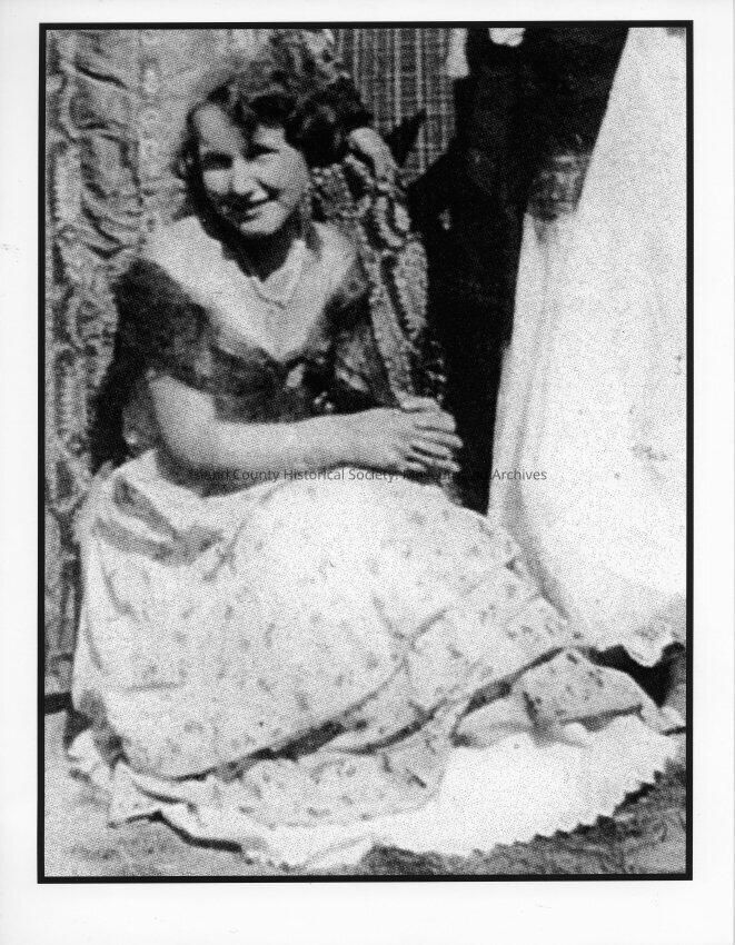 Aileen Terry, granddaughter of Chloe Ann Terry Doyle, wearing Chloe's wedding dress. Samples of fabrics for the dress are in the folder. See also 200.100.040.