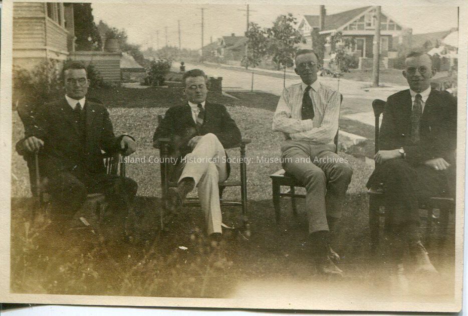 A photo of a group of four men sitting in chairs outside. They are in someone's front yard. All four men are wearing suits, ties, and glasses. There are houses and a street in the background. The back of the photo says, "The Snap Shot Shop. Better developing, printing & enlarging. Everything for the Ameteur Photographer. 4219 Fourteenth Avenue, N.E., University Station, Seattle".Lexicon