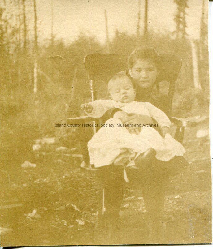 A photo of a young girl sitting on a wooden chair outside. The girl is holding a baby in a white outfit. The photo was taken in a clearing in the woods, there are trees in the background. There is writing on the back of the photo but it is not complete and illegible.
