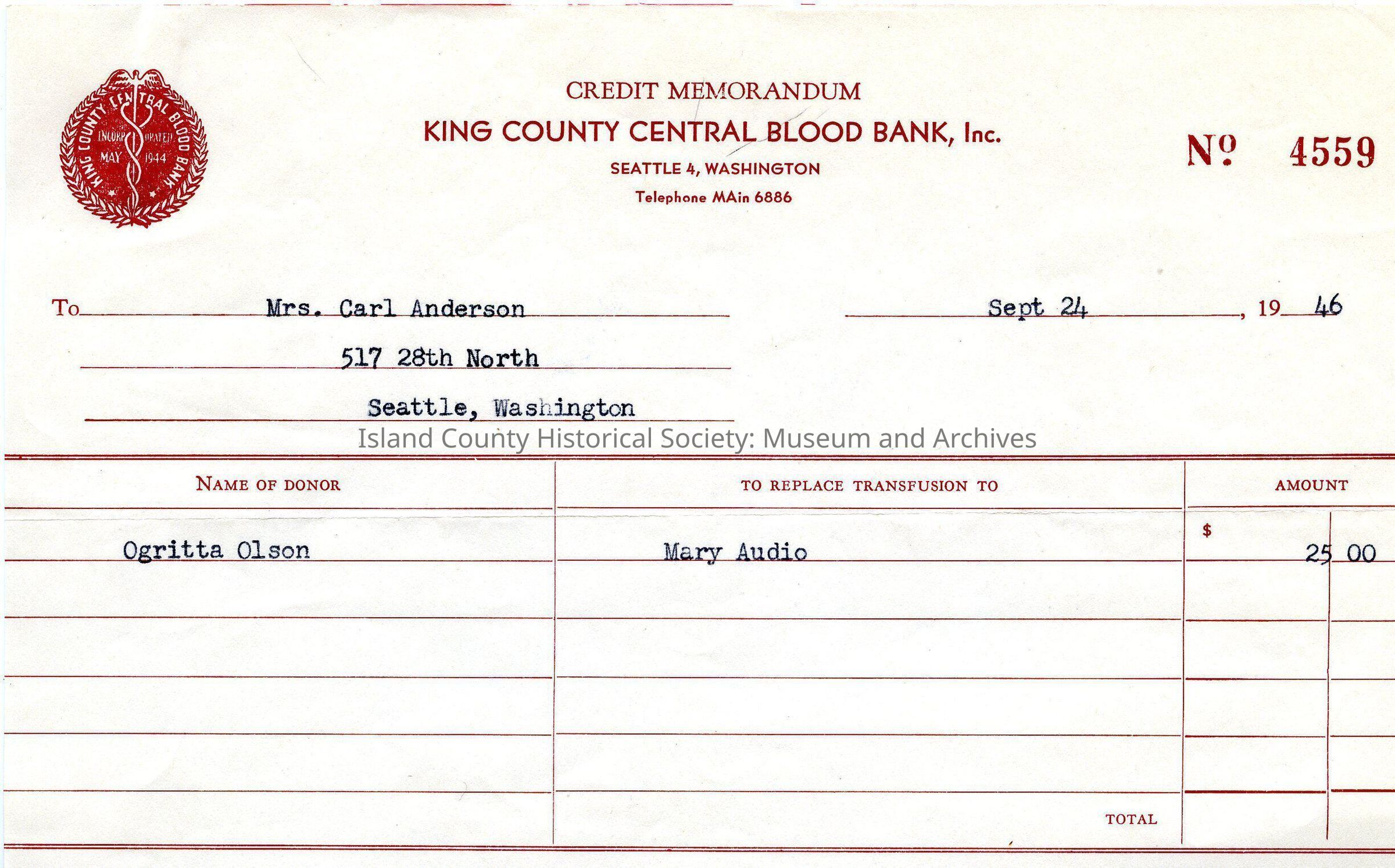Credit Memorandum from King County Central Blood Bank dated September 24 1946 noting the name of blood donor, transfused to Mary Autio, and cost.