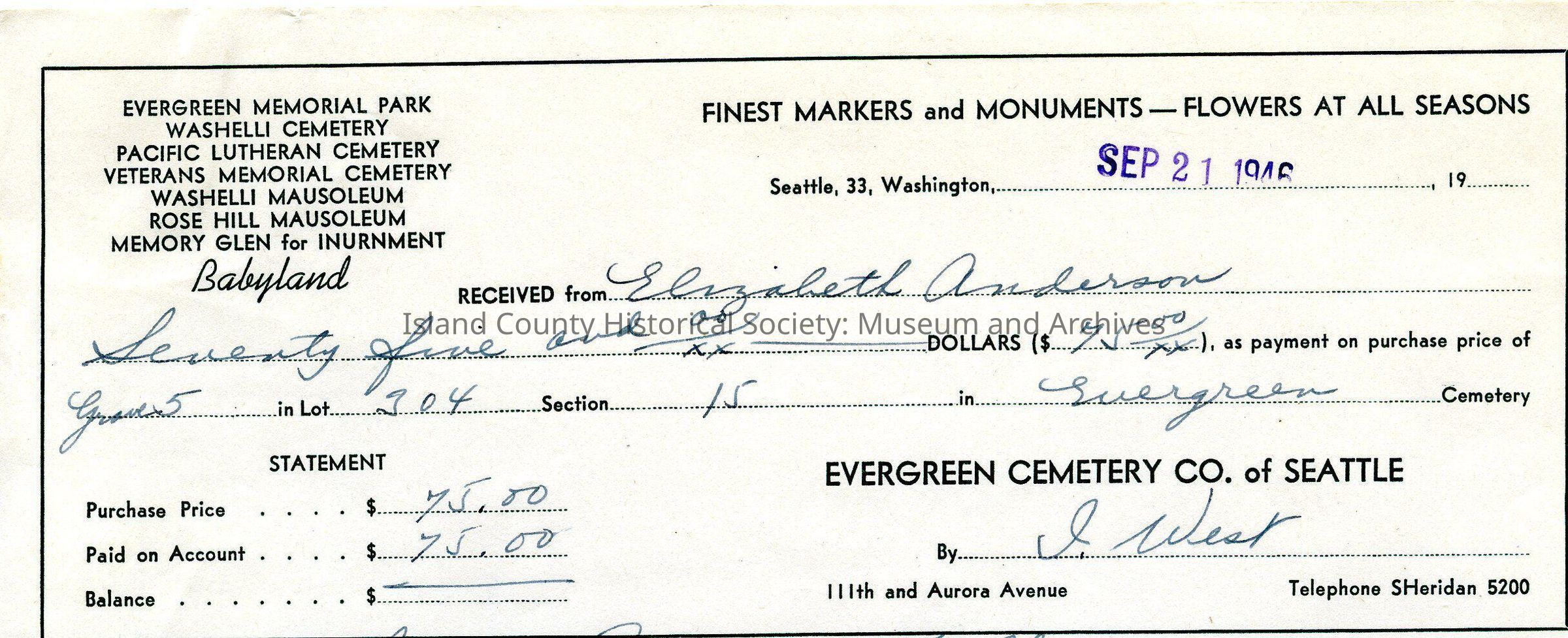 Receipt from Evergreen Memorial Park Cemetery to Elizabeth Anderson acknowledging her payment for a grave plot. Dated September 21 1946.