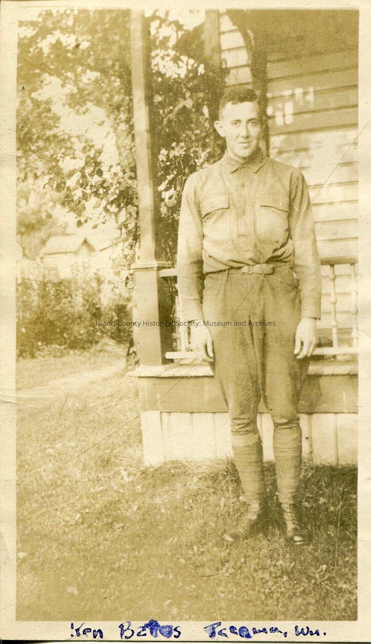 A photo of a young man in uniform standing outside, in front of a house. The man is smiling at the camera. The bottom of the photo says, "Ken Batos, Tacoma, WA". There are trees, bushes and other houses in the background.Lexicon