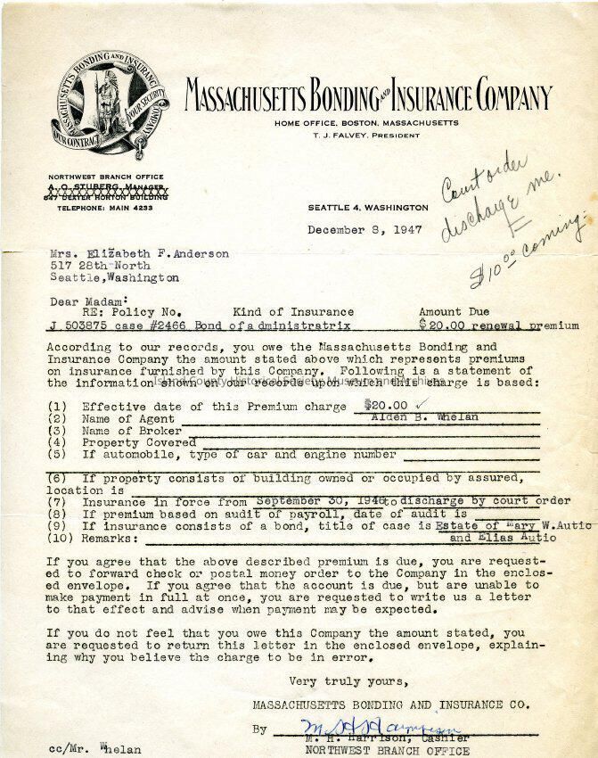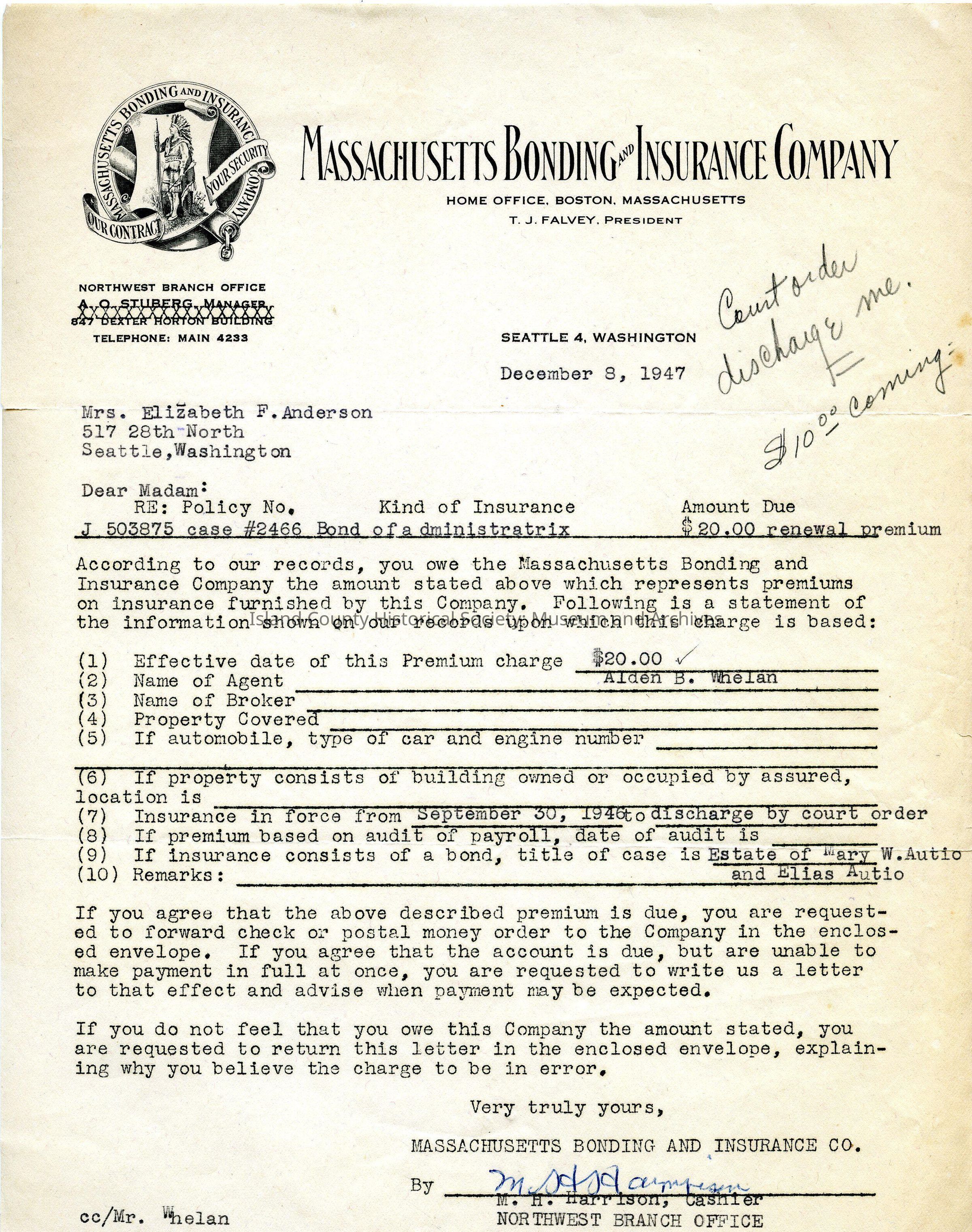 Letter from Massachusetts Bonding and Insurance Company to Elizabeth Anderson dated December 8 1947. Informs her that she owes premium charge to Alden Whelan regarding the case of Mary and Elias Autio estates. Scrawled in pencil on right notes that court order discharged her from payment.