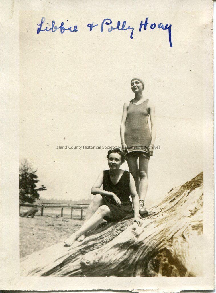 A black and white photo of two women in swimsuits on the beach. One of the women is standing on a large piece of driftwood and the other woman is sitting on the driftwood. The woman who is standing is wearing a bathing cap. The background of the photo is the beach. The top of the photo says, "Libbie & Polly Hoag".