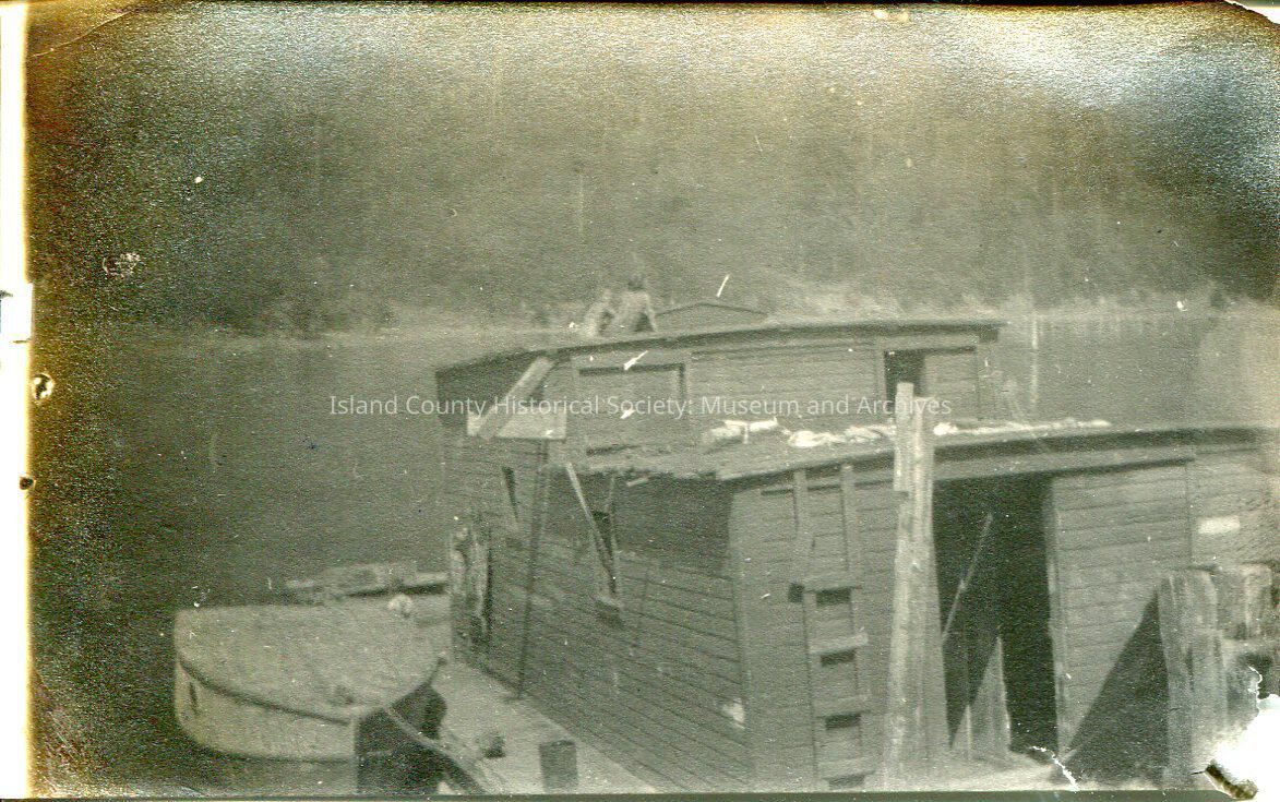A black and white photo of a barge or possibly a houseboat. There is a larger, dark colored "building" that has ladders, windows and doorways on it with a small boat tied next to it. There are two children on the top of the "building. There is water in the background.