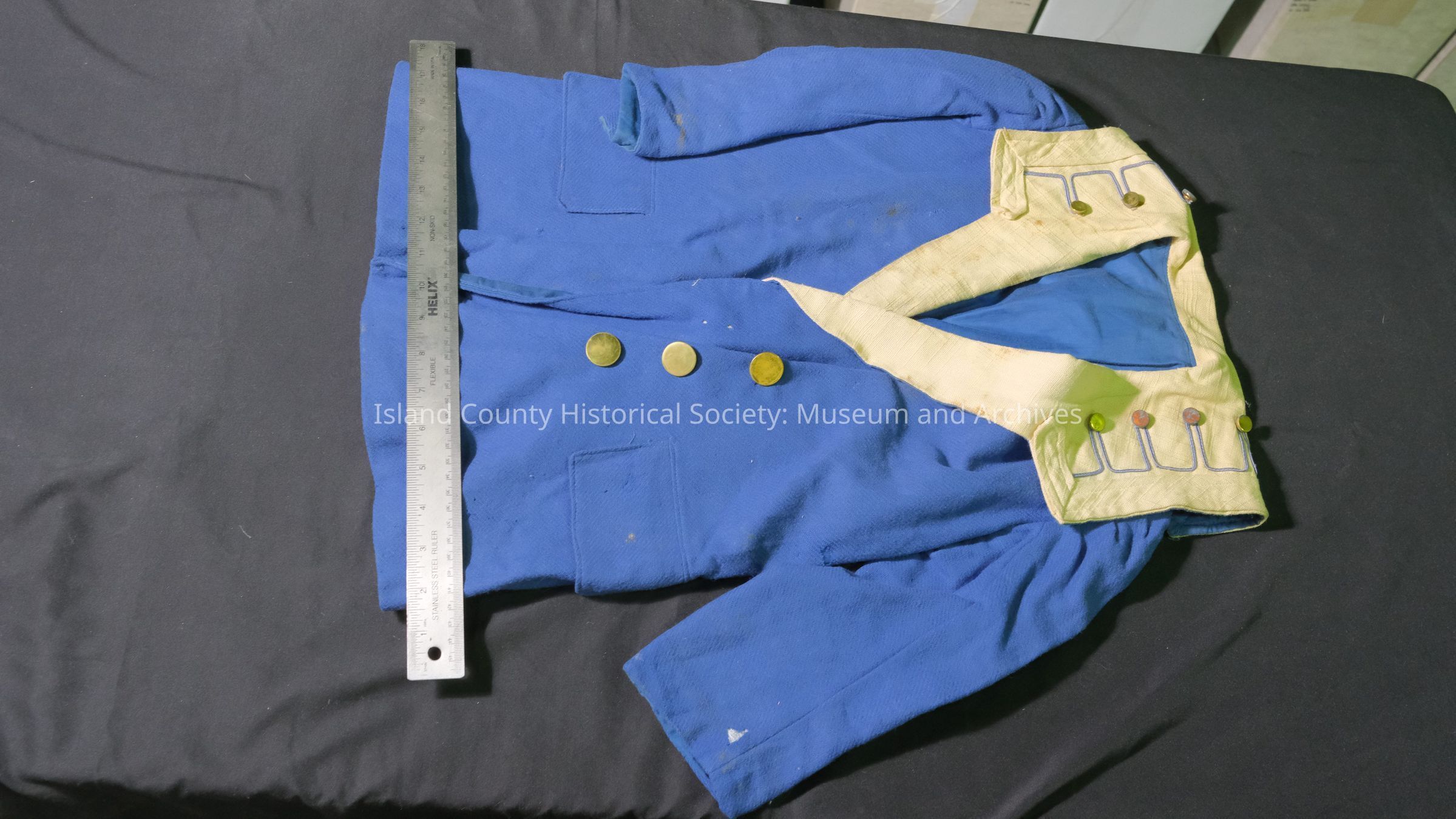 Child's coat, blue wool, linen collar, brass buttons.