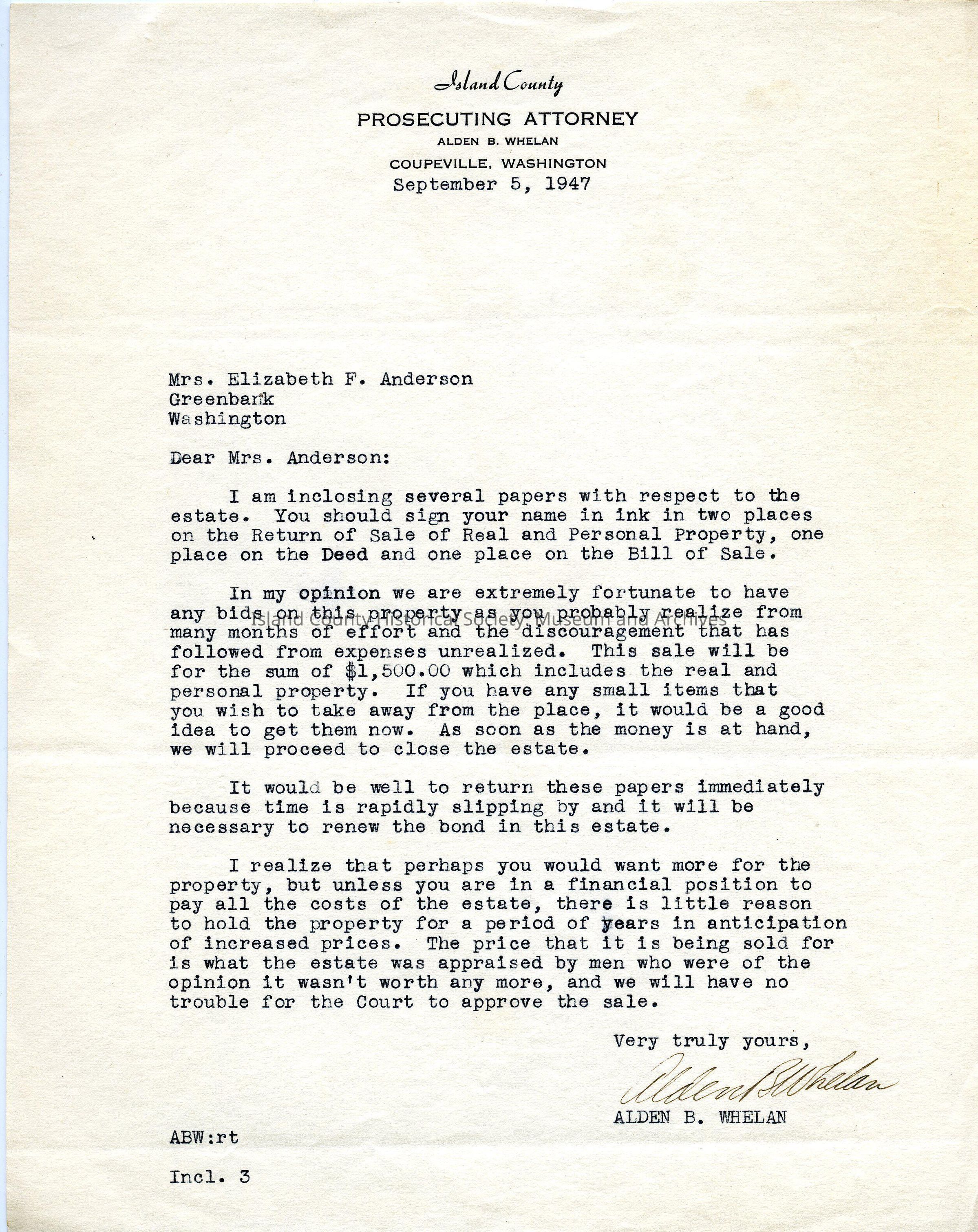 Letter from Alden Whelan to Elizabeth Anderson dated September 5 1947 concerning a bid for the sale of the Autio estate, papers for her to sign and return for its sale and reasons to sell rather than wait for higher bid.
