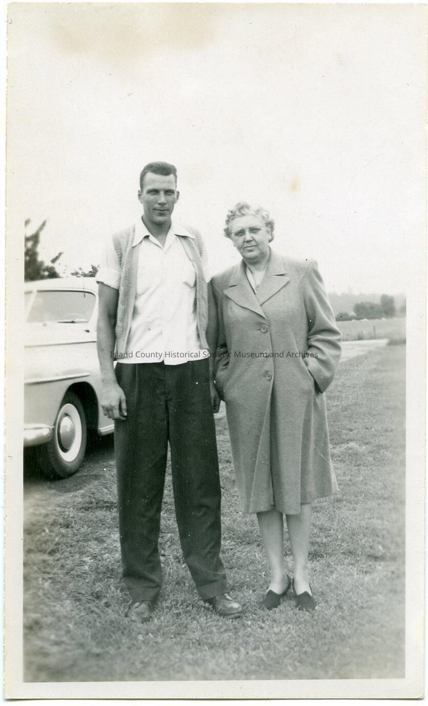Photo of a very tall man and woman wearing a coat, standing in front of a car. On the back: May 18, 1947. Brannan Terry Harrison, 6 ft. 7 in. tall, & Ruth Terry Harrison