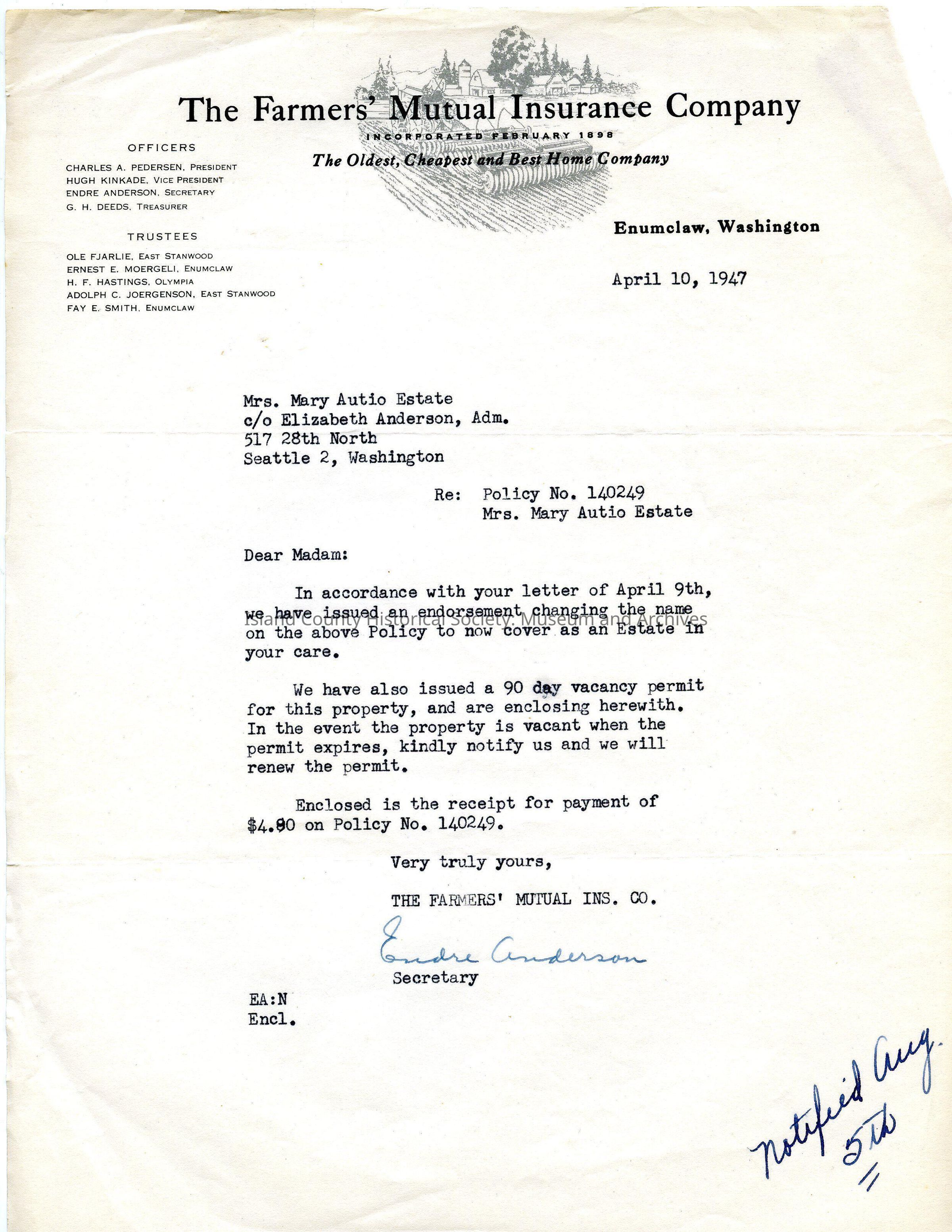 Letter from Farmers' Mutual Insurance Co to Elizabeth Anderson dated April 10 1947 issuing her a vacancy permit for the property and payment receipt for this. Note in blue ink on bottom right: Notified Aug 5th.