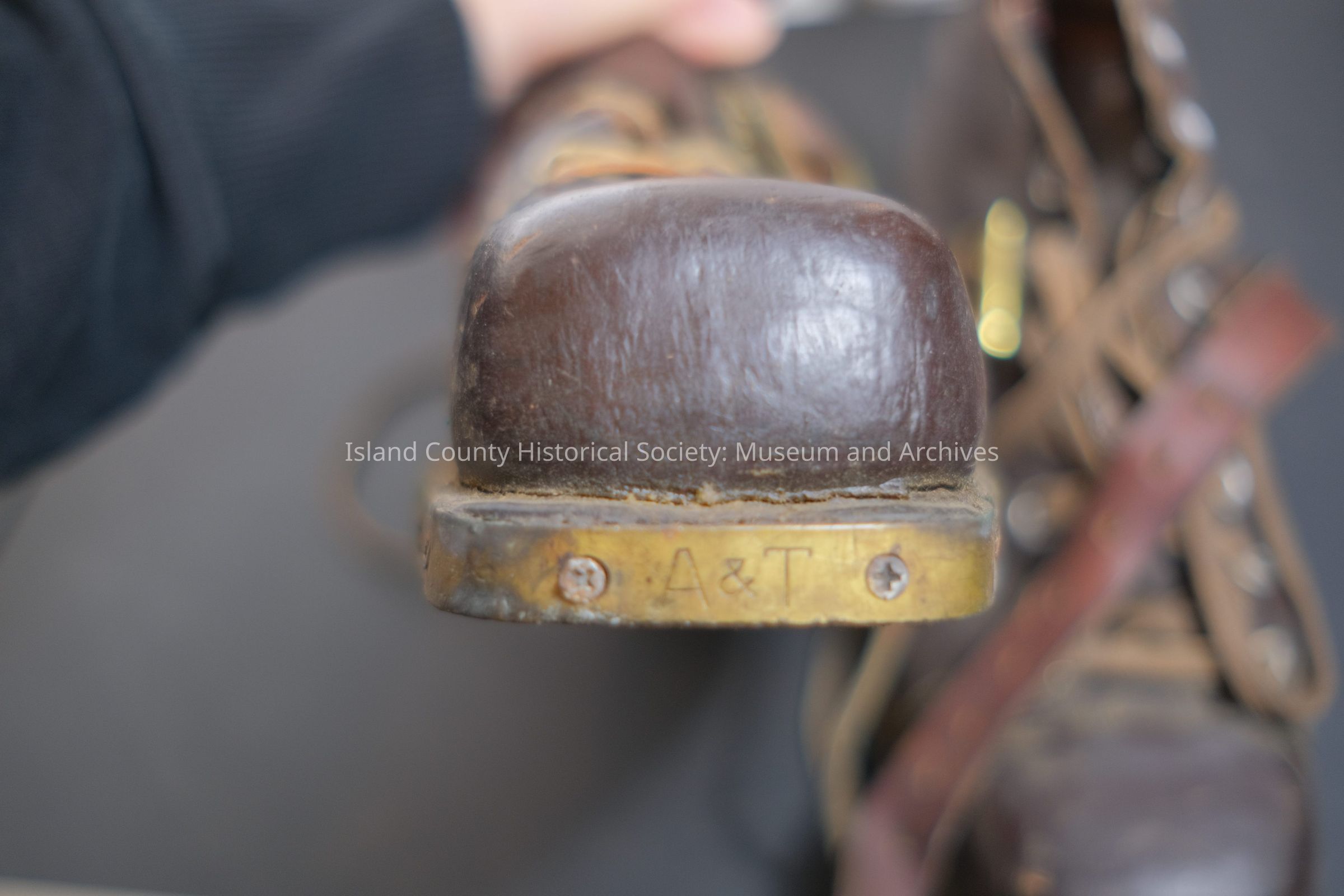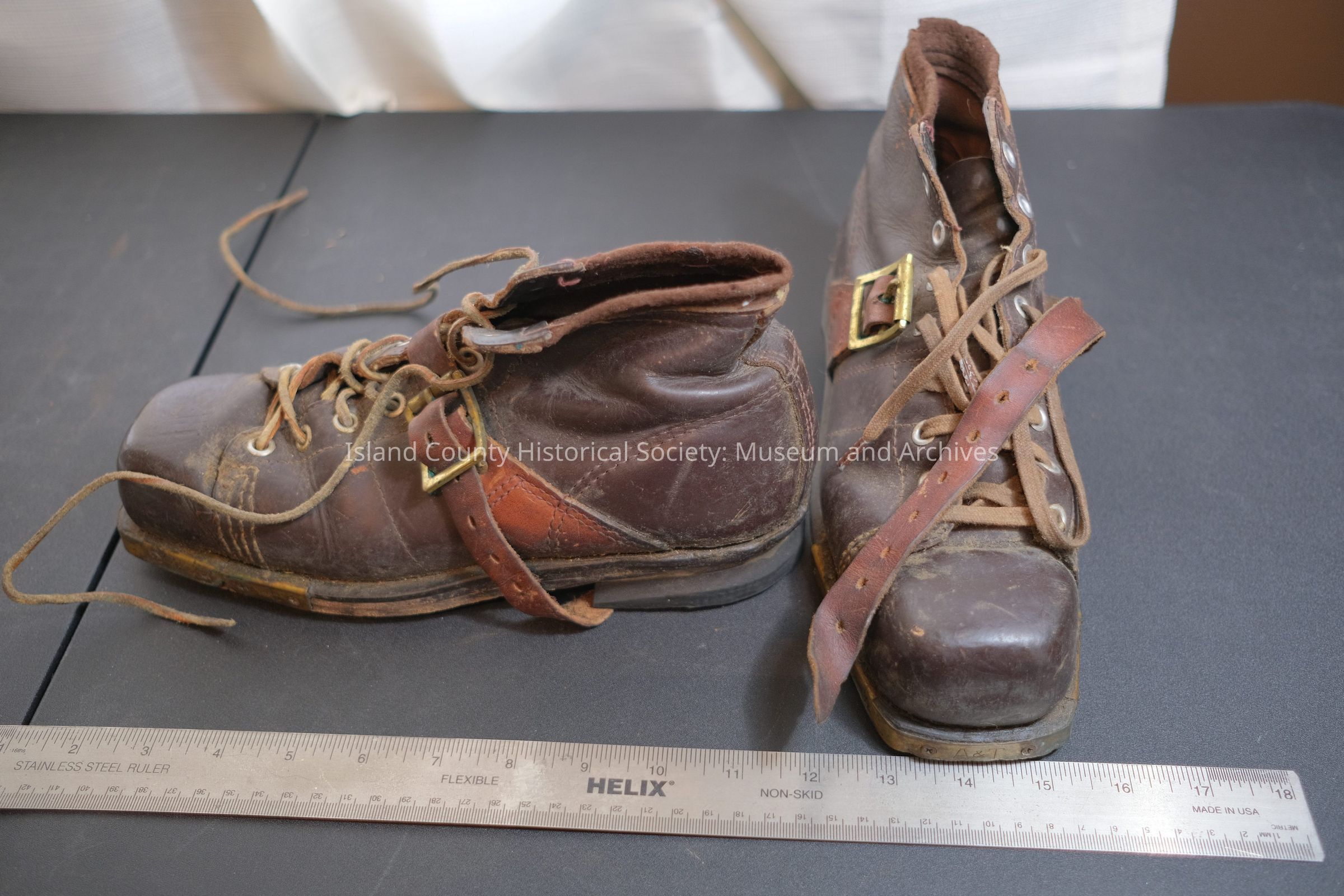 brown leather ankle length boots w/ metal reinforcing around sole of toe to clamp on ice skates