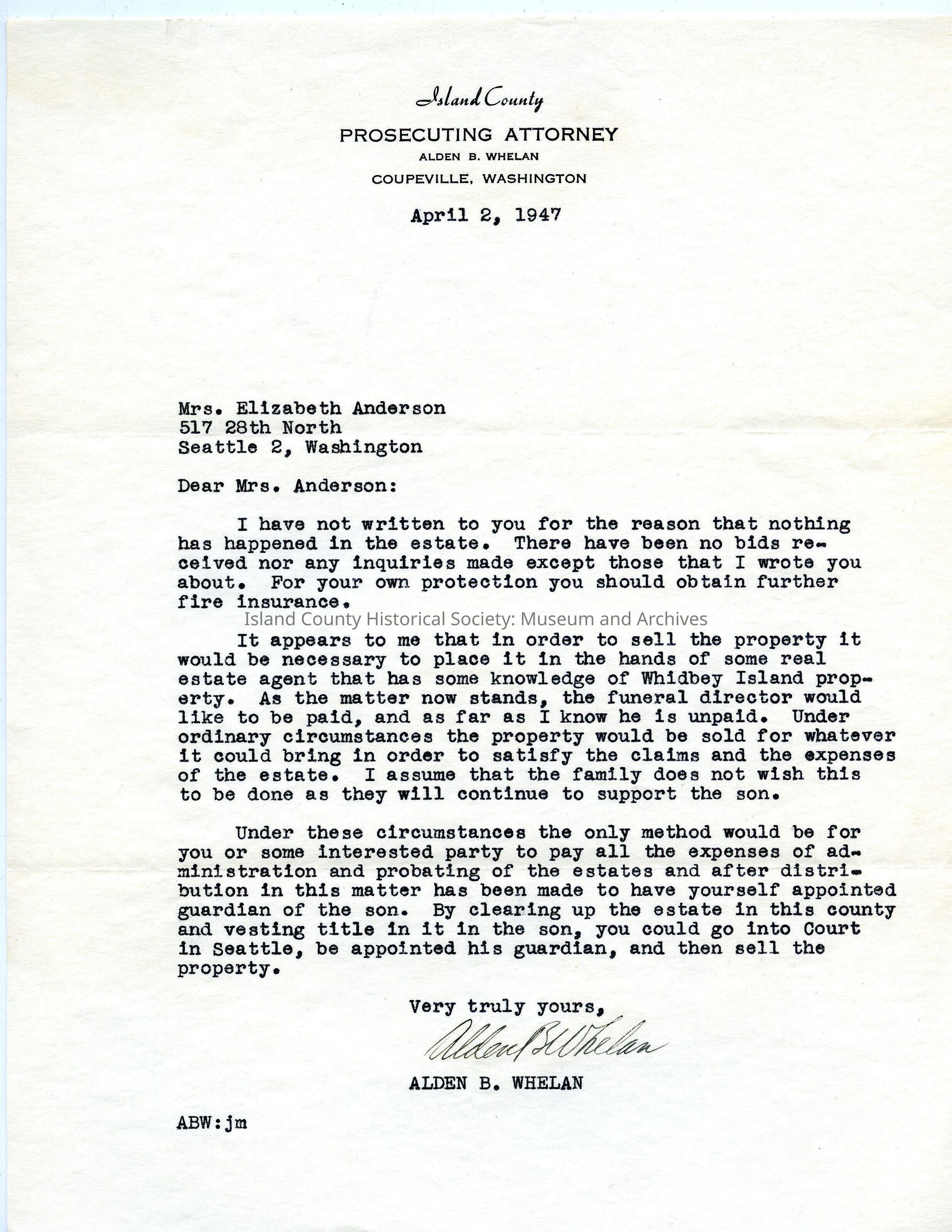 Letter from Alden Whelan to Elizabeth Anderson dated April 2 1947 informing her that so far no bids on the Autio property, need for fire insurance, payment to funeral director and suggesting she become Walter Autio's guardian.