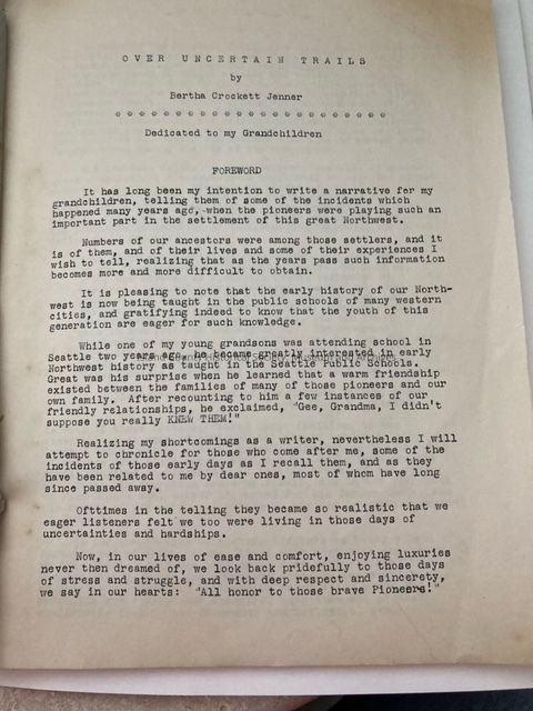 Jenner, Bertha Crockett, Over Uncertain Trails, (no further details, inscription states written in 1940). 2016.013.001Lexicon