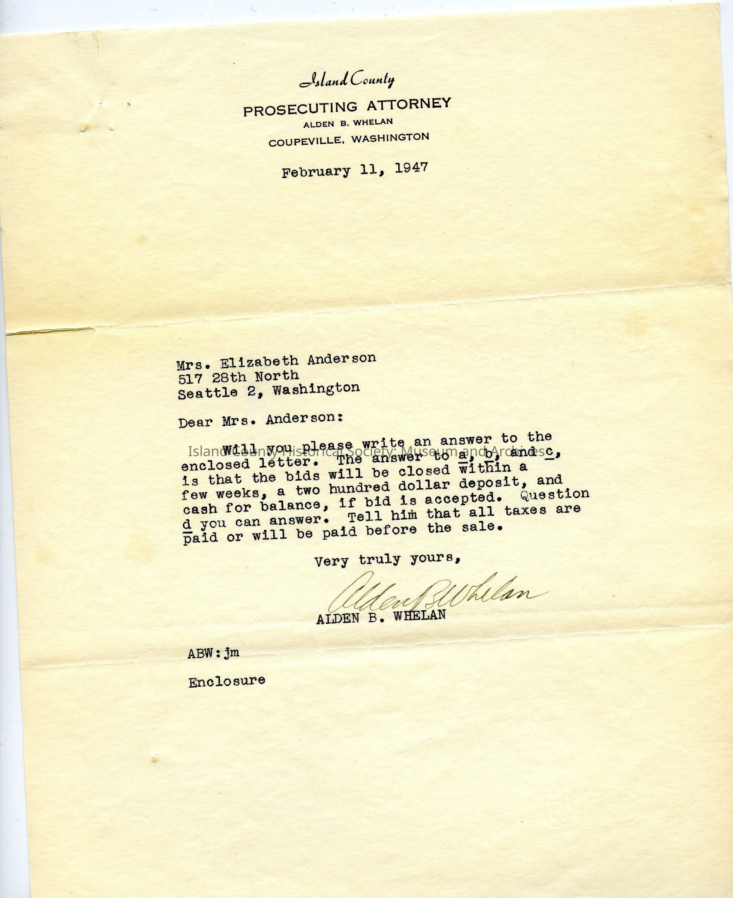 Letter from Alden Whelan to Elizabeth Anderson dated February 11 1947 asking her to answer Lieutenant E.H. Longfellow's questions pertaining to the Autio property. He tells her what to answer to some questions.