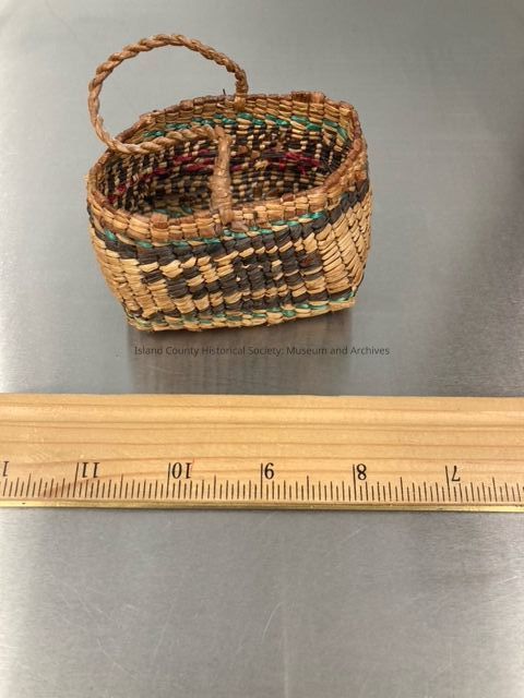 small 2"x3" woven basket of brown, green, red and dark brown with central handle, made by Lower Skagit people of Coupeville, give to Hattie Race Swift