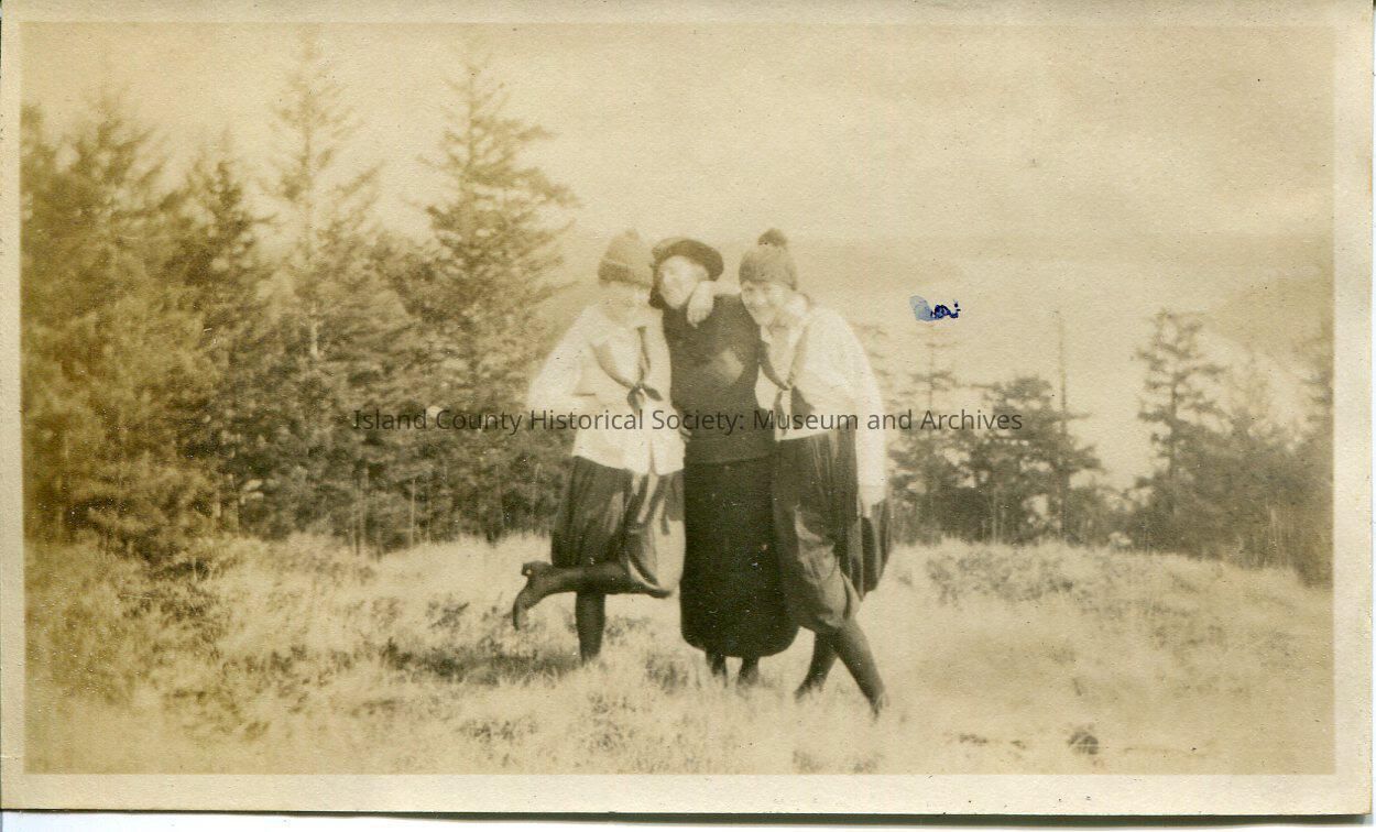 A photo of three women with their arms around them. They are standing on a grassy hill overlooking a lake or shore, trees behind them. They are wearing skirts, tops with long ties, caps. Related to 2015.074.652-.654.