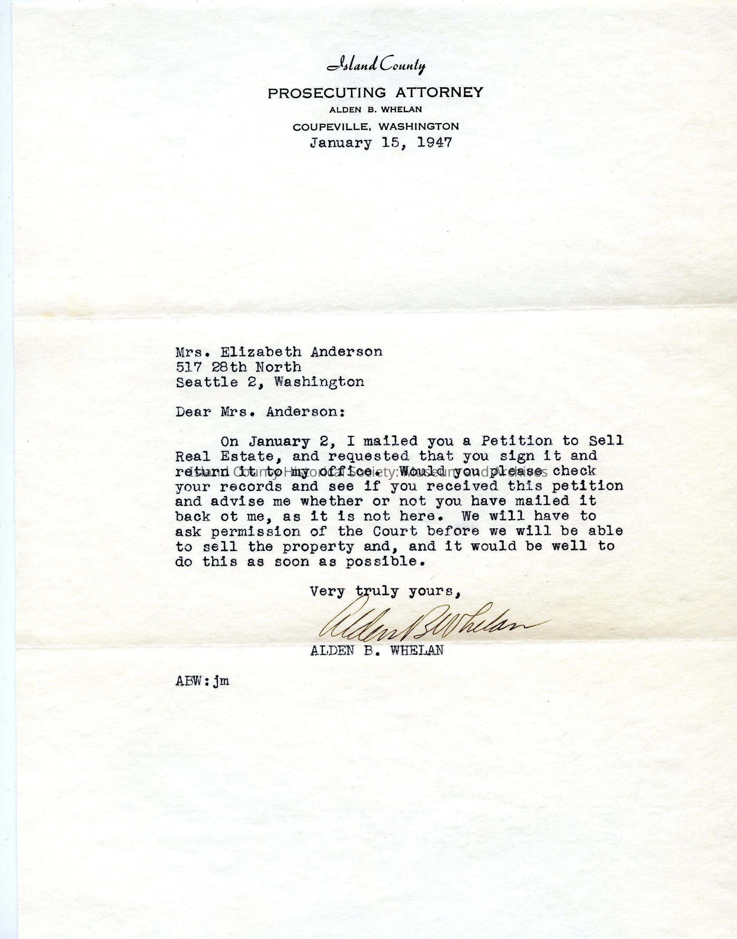 Letter from Alden Whelan to Elizabeth Anderson dated January 15 1947 reminding her to sign a petition he mailed her and return it in order to go to court and sell the Autio property.