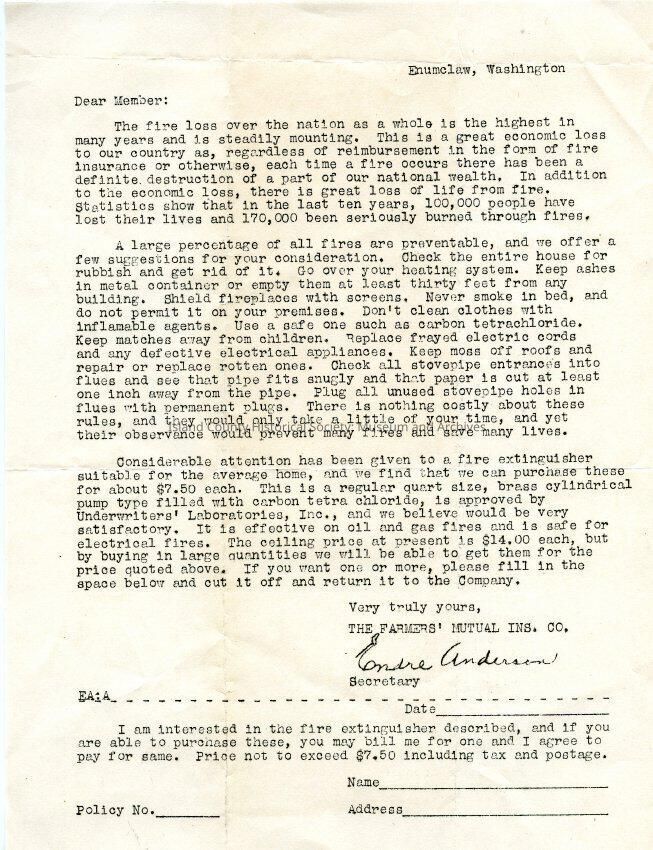 Letter from Farmers' Mutual Insurance Co. to Member (presumably Elizabeth Anderson). No date (probably 1947). Informs member of the importance of obtaining fire insurance, but also on fire prevention- what property owners should do to reduce the likelihood of a fire.