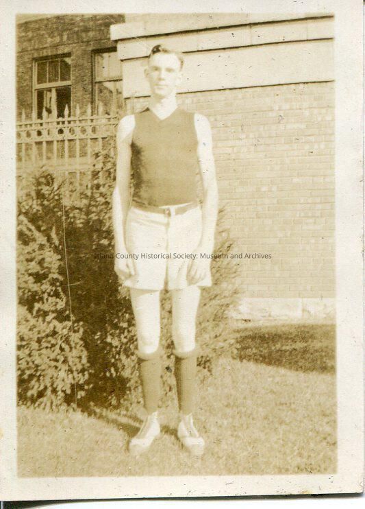 A photo of a man in a sleeveless v-neckk top, shorts and belt, long wooly socks curled at the tops, shoes. Standing in front of a brick building, bush and other building behind that.Lexicon