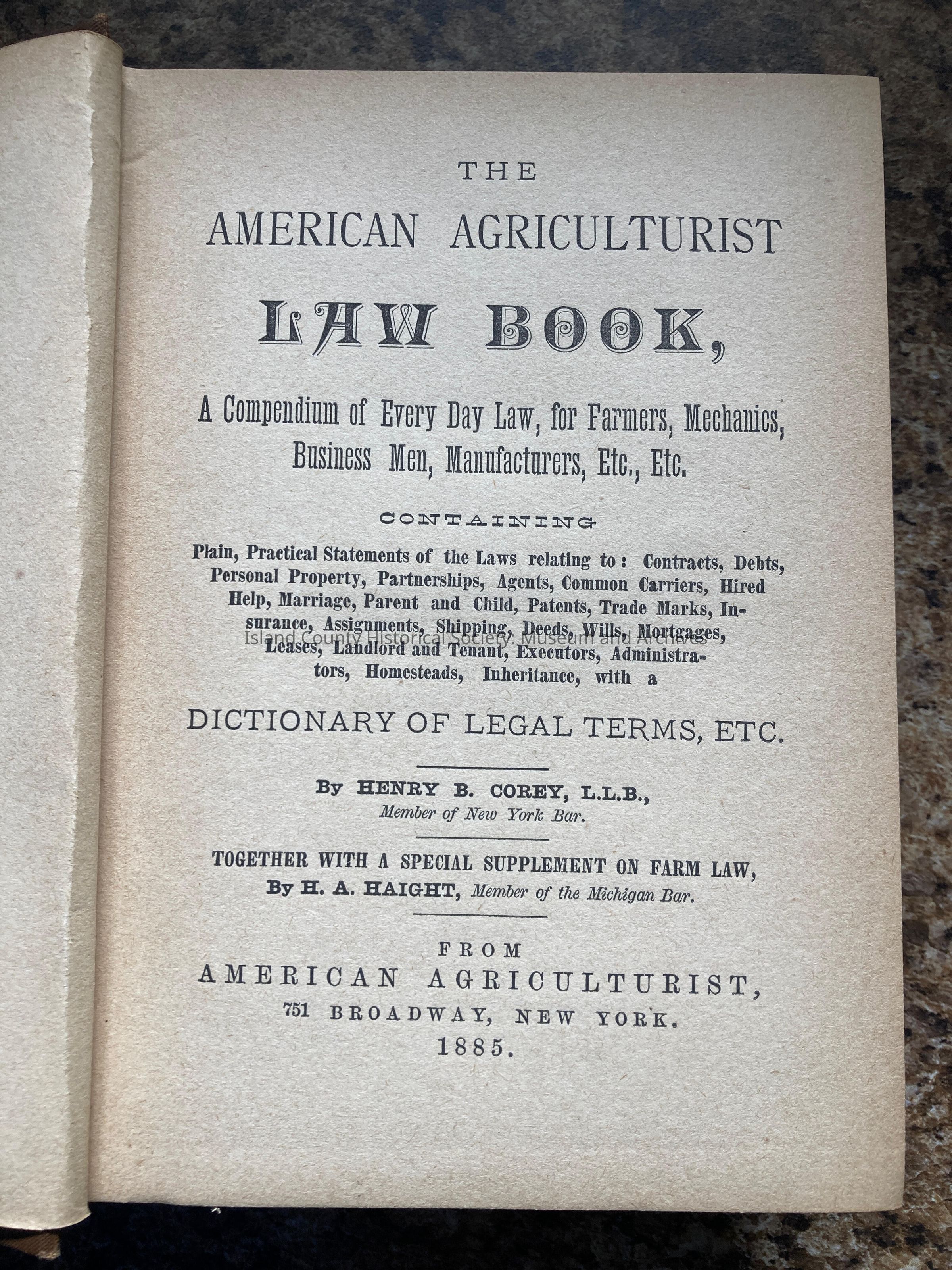 Corey, Henry B., L.L.B., The American Agriculturist Law Book…, American Agriculturist, New York, 1885. 92-1-39 9.3Lexicon