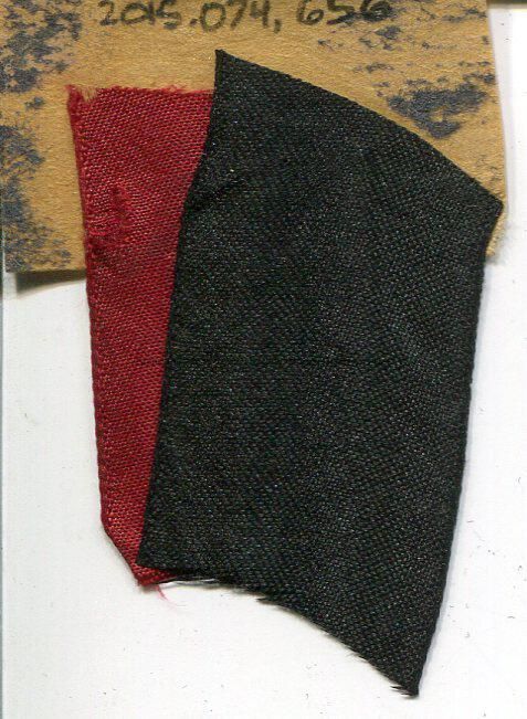 Two small pieces of material - black and deep red satin - might be from a bow, decoration, medal.