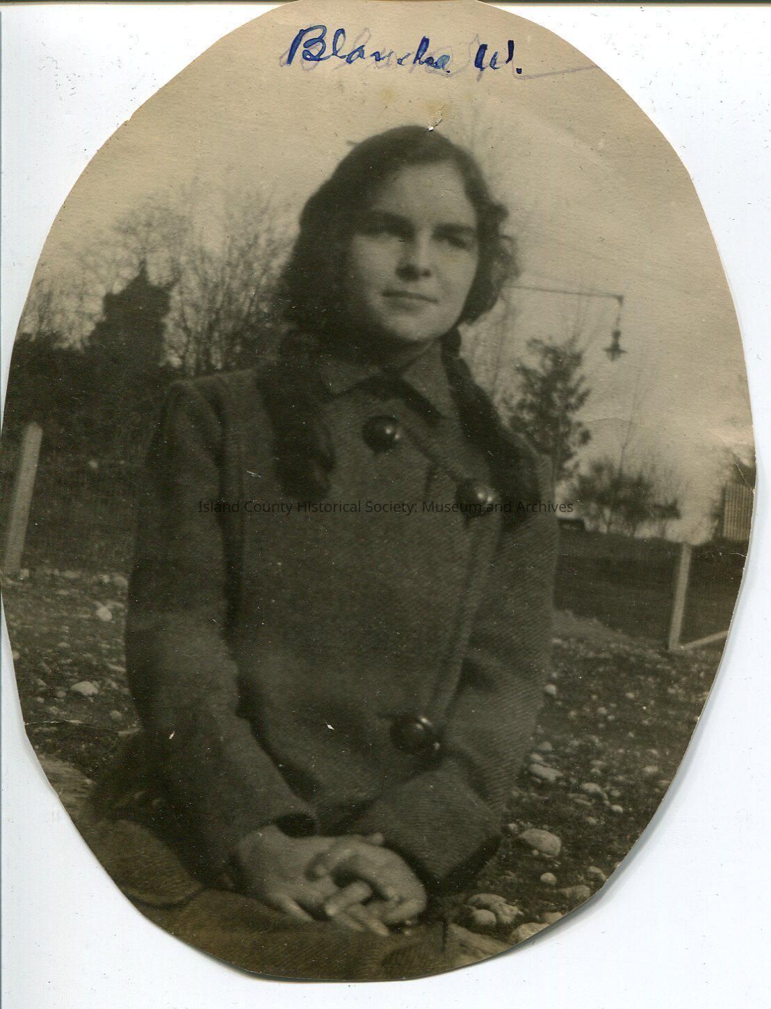 A photo of a young woman with long curly hair, looking to her left, in heavy wool coat with big buttons. She is sitting with her hands on her lap, fingers criss-crossed. Fence, light pole and trees in background. Rocks on the ground. On the front: "Blanche W." The photo has been cut into an oval.Lexicon