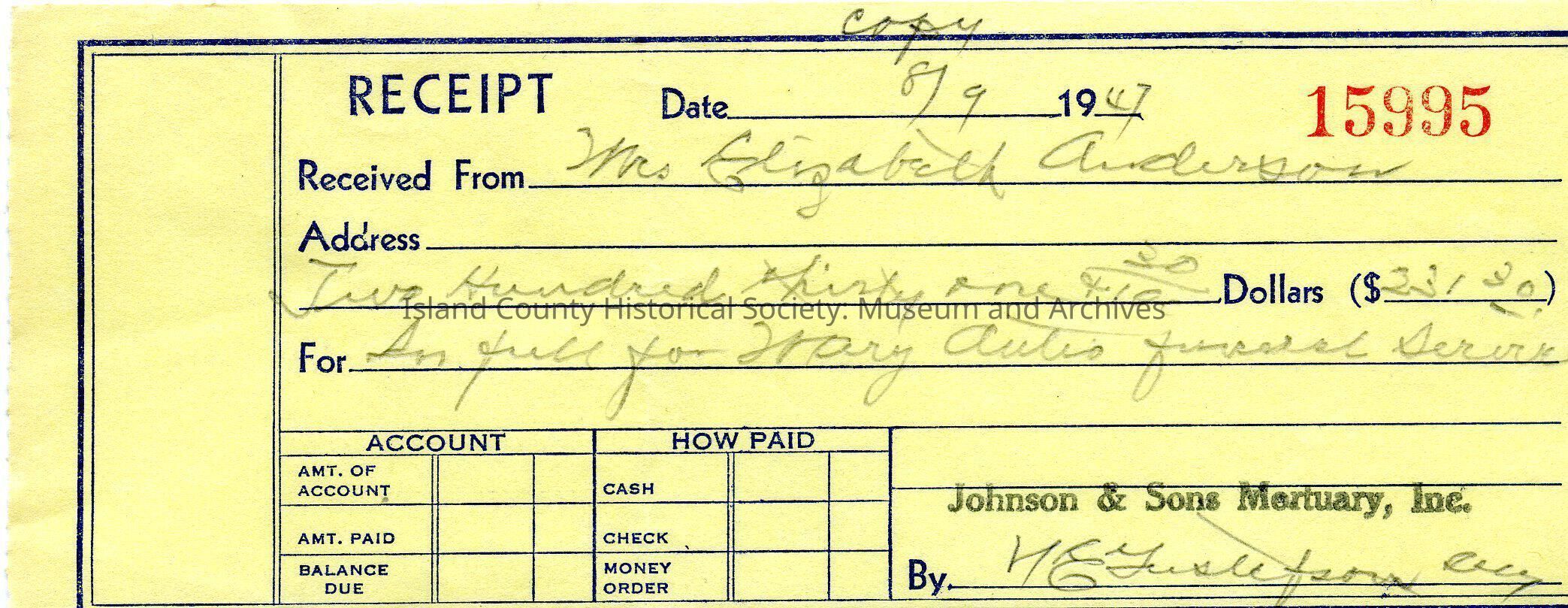 Receipt on yellow paper with blue print. Blank lines filled in with pencilled writing. Received from Elizabeth Anderson dated 8/9 1947. $231.30 paid to Johnson & Sons Mortuary, Inc. Stamped in red 15995. (For Mary Autio's funeral service).