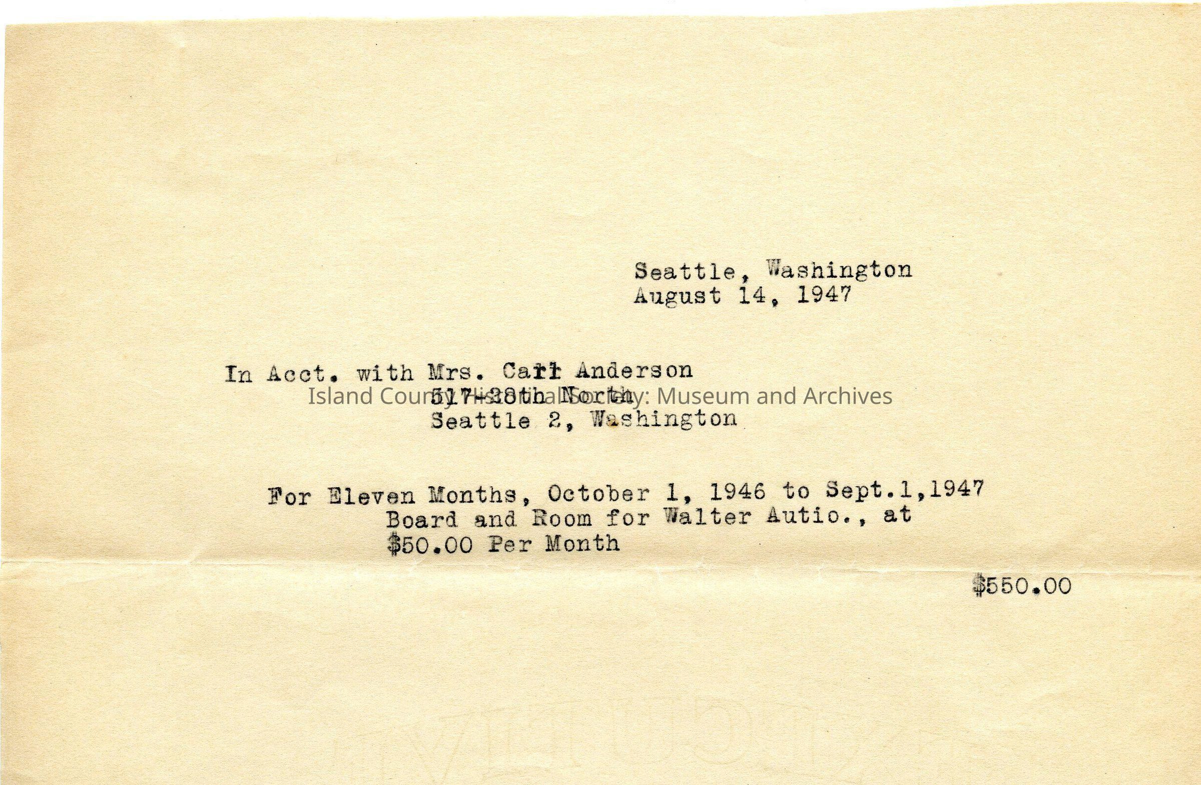 Note on slip of paper dated August 14 1947. States that Elizabeth Anderson was given allowance for Walter Autio's care between October 1 1946 and September 1 1947.