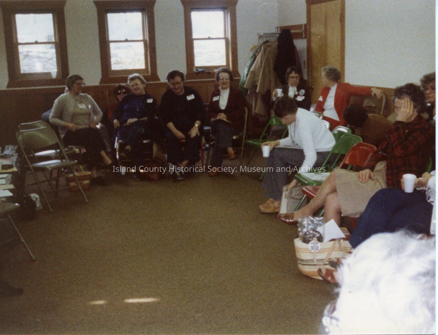 League of Women Voters of Whidbey Island. Women wearing name tags and holding coffee cups sit in Fireside Room of Coupeville United Methodist Church.